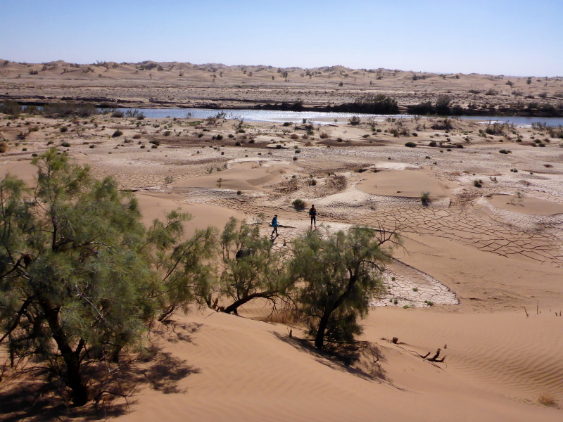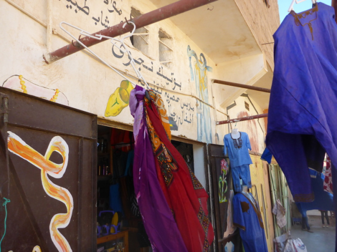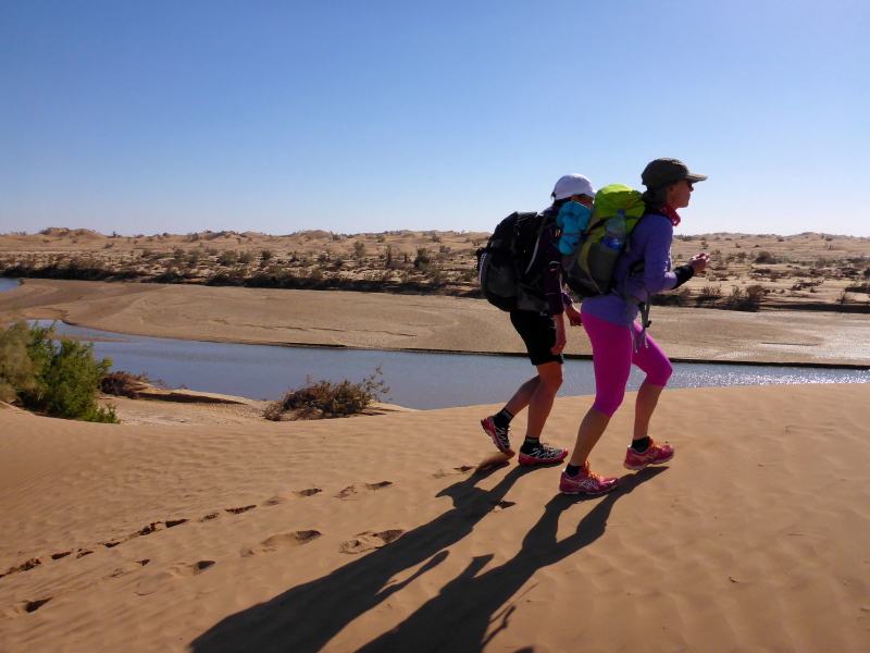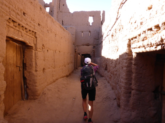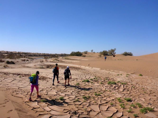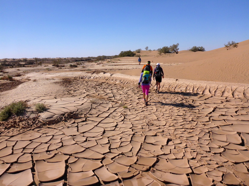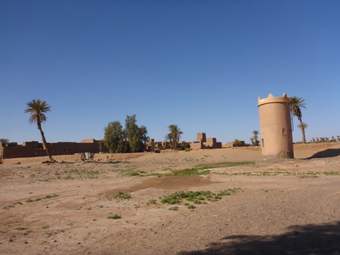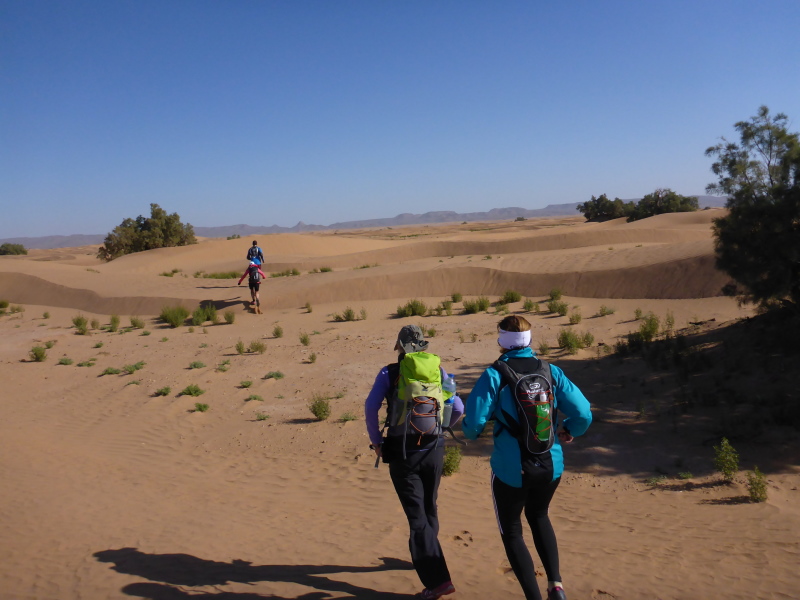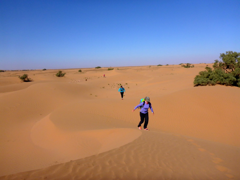 Am Morgen gibt es wieder ein einfaches Frühstück, heute allerdings mit einem typischen, würzigen Berberomelett. Einfach lecker das Essen hier bei den Berbern! Nachdem alles gepackt und im Geländewagen verstaut ist, laufen wir über die Dünen und durch Steinwüsten, um am Flussbett des Draas wieder zurück in die Palmeraie zu gelangen. Eine nette Trainingsrunde über Sanddünen, Steine und durch Gestrüpp! Nach dem Mittagessen in der Palmeraie packen wir erneut das Geländeauto, um zurück nach Zagora zu fahren. Ein Stopp in Tamegroute, dem Töpferdorf, bringt uns die marokkanische Töpferkunst näher. Ein kleines Souvenir aus Tamegroute soll mich immer an diese schönen Tage in der Wüste von Zagora mit all den netten Leuten erinnern.