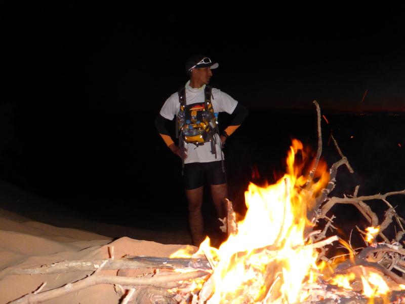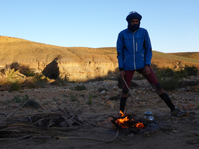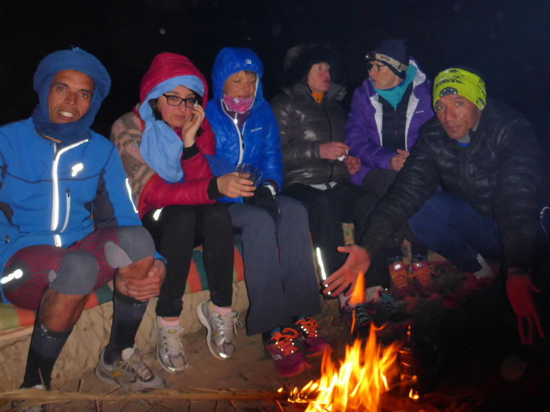 Es folgt der schon gewohnte Ablauf: Schlafbiwak aufsuchen, warme Klamotten für die kalte Nacht anziehen und es sich im Essenszelt bequem machen. Es ist stockdunkel und einer fehlt noch aus unserer Gruppe. Samir ist bisher nicht eingetroffen. Lhoucine hat aber bereits übers Handy Kontakt aufgenommen. Alles im Plan. Für mich ist es ein Rätsel, wie sich hier einer orientieren kann. Alles sieht doch fast gleich aus. Ich wäre wohl verloren. Lahcen und Lhoucine machen ein Feuer auf einer Düne und Samir hat keine Mühe, zu uns zu finden. Jetzt können wir den restlichen Abend gemeinsam genießen.