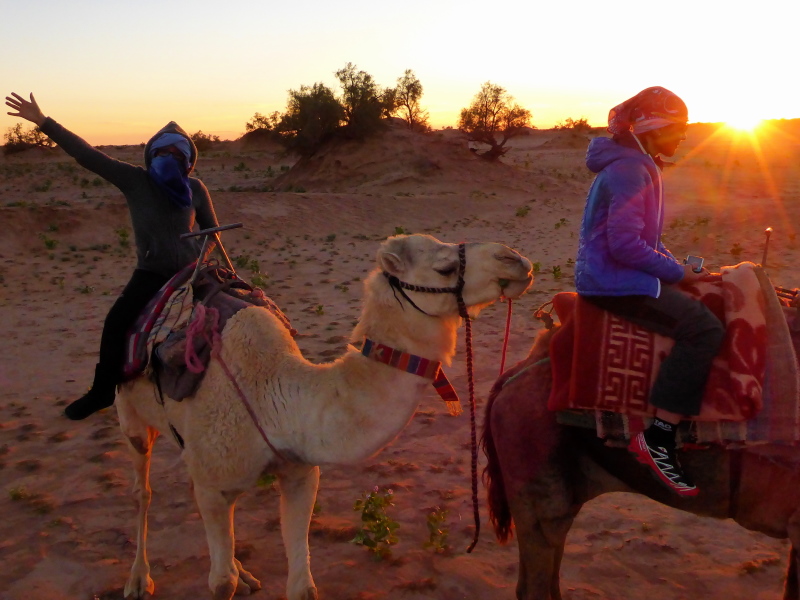 Die Nacht ist wie vorhergesagt bitterkalt. Sobald aber die Sonne über den Hügeln aufgeht, kommt die Wärme zurück. Wir können, noch gut eingepackt, zum Frühstück draußen sitzen. Nachdem dann das Biwak abgebaut und bereit zum Verladen auf den Dromedaren ist, gibt es ein Foto und schon geht es los.