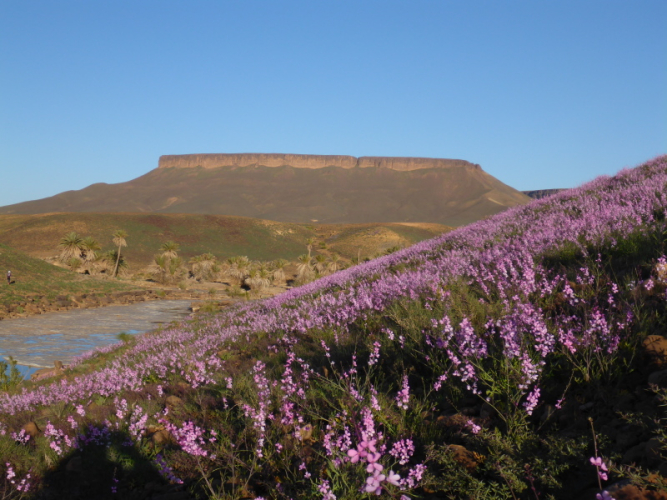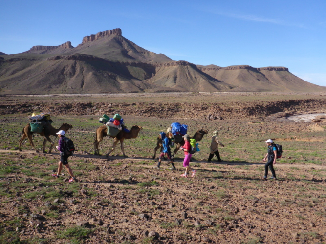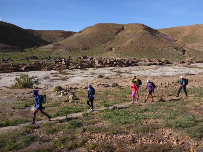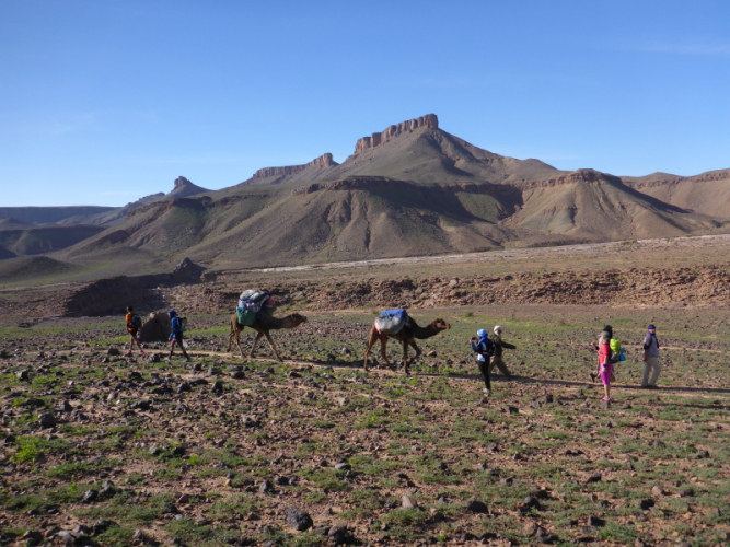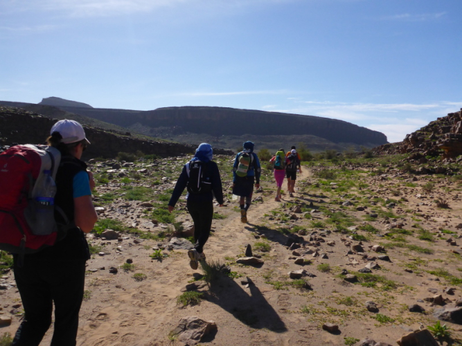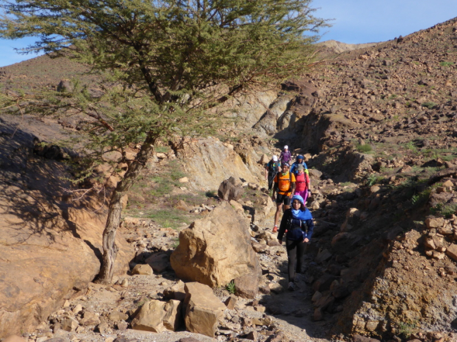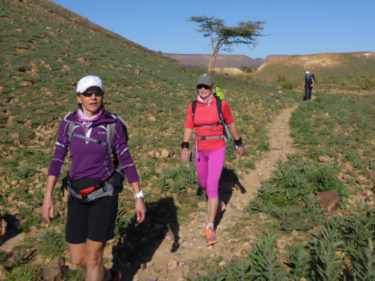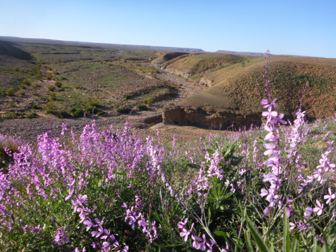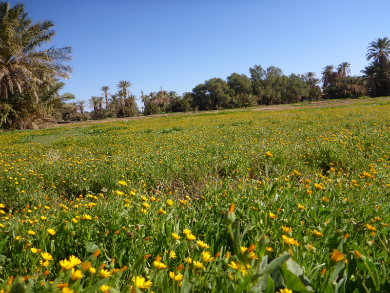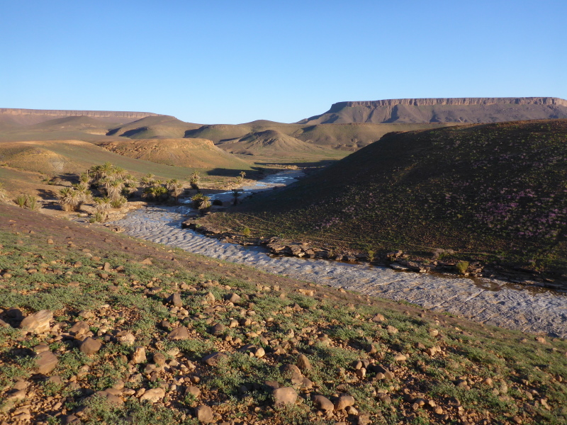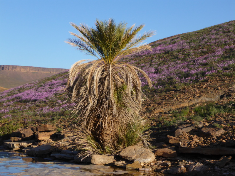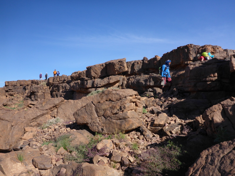Ein steiler Anstieg auf einem steinigen Weg bringt uns dann über den Col de Tizi n´oum lâachar-Pass mit 1070 m. Danach befinden wir uns auf schmalen, teils gut zu laufenden Gebirgspfaden. Immer wieder muss ich stehen bleiben, um die Farben und das Licht auf mich wirken zu lassen. Um uns herum erheben sich rotbraune Tafelberge, die in der Sonne leuchten. Durch die vielen Niederschläge der vergangenen Woche sind die Wege und Hänge mit bunten Blumen gesäumt. Ein einzigartiges Farbenspiel!