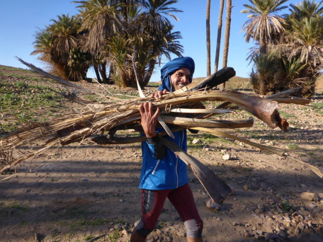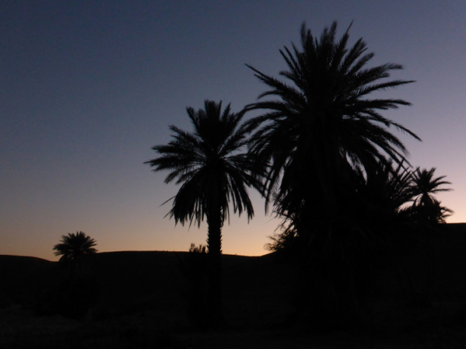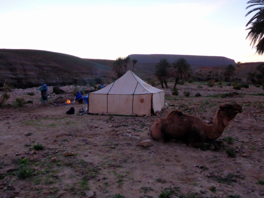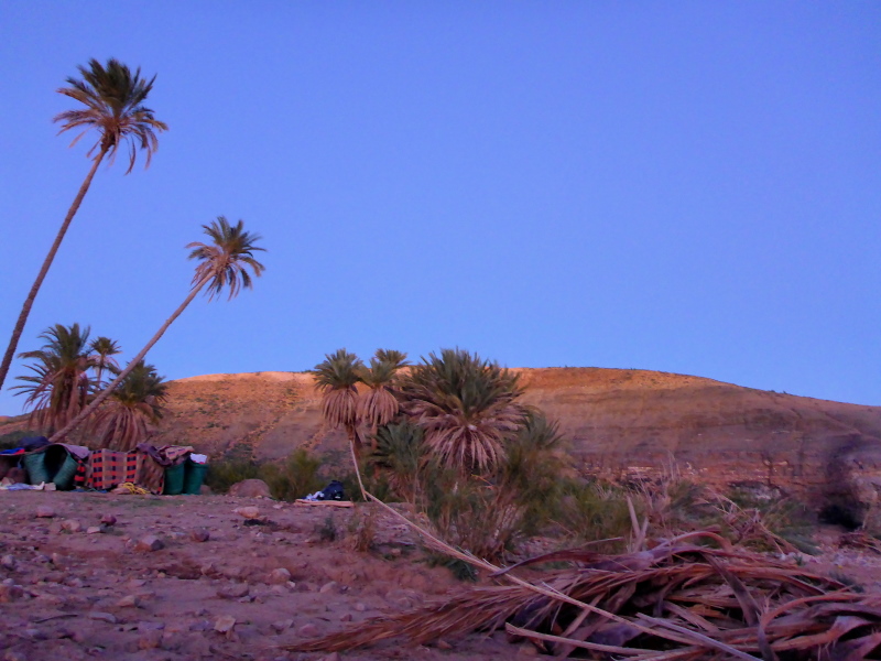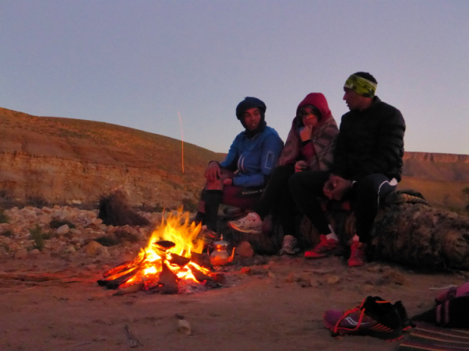 Unter hohen Palmen steht bereits das Zelt, in dem wir später essen und schlafen. Alles ist für uns vorbereitet: Der süße Minztee, ein typisches marrokkanisches Getränk, ist bereits aufgebrüht und wird gleich nach unserer Ankunft serviert. Nun muss noch das Holz fürs Lagerfeuer gesammelt werden, um es dann auch gleich zu entzünden. Mit dem Sonnenuntergang hinter den Hügeln kommt auch gleich die Kälte. Wir ziehen unsere warmen Kleider an und versammelten uns am Lagerfeuer.