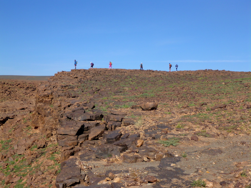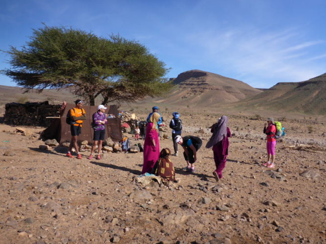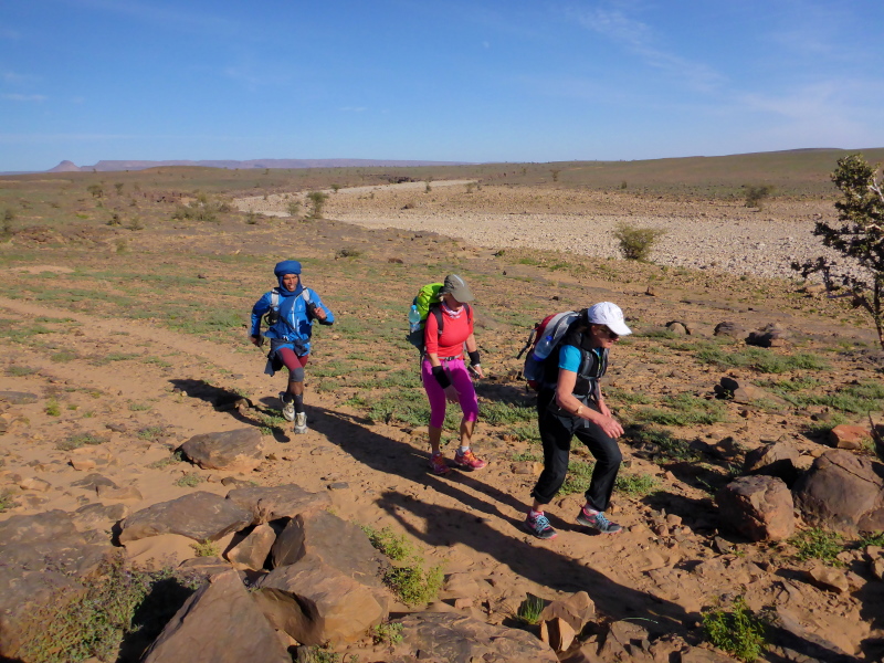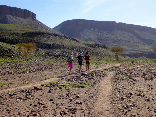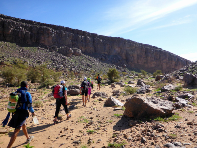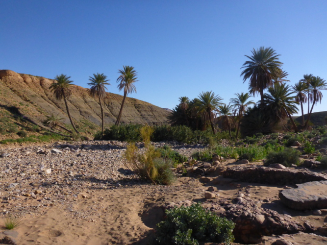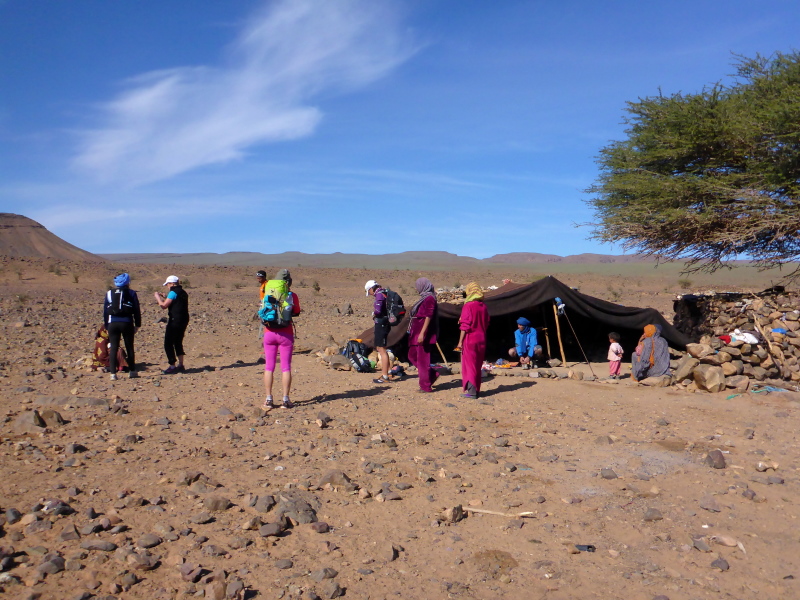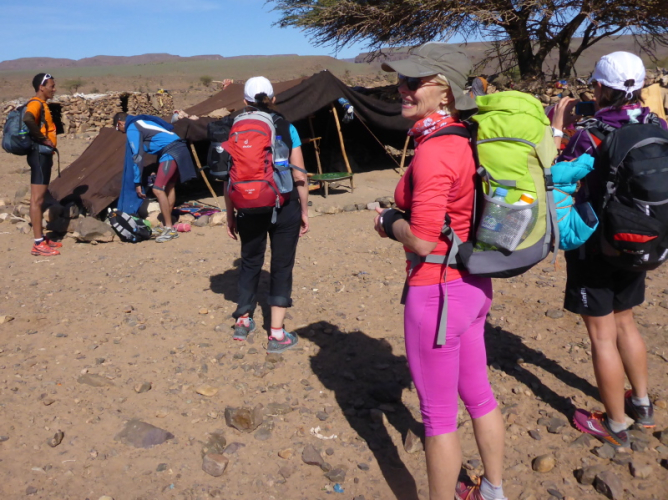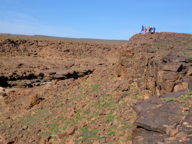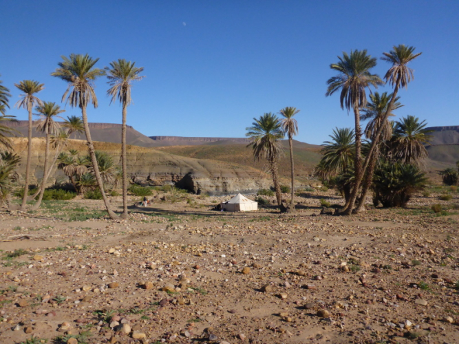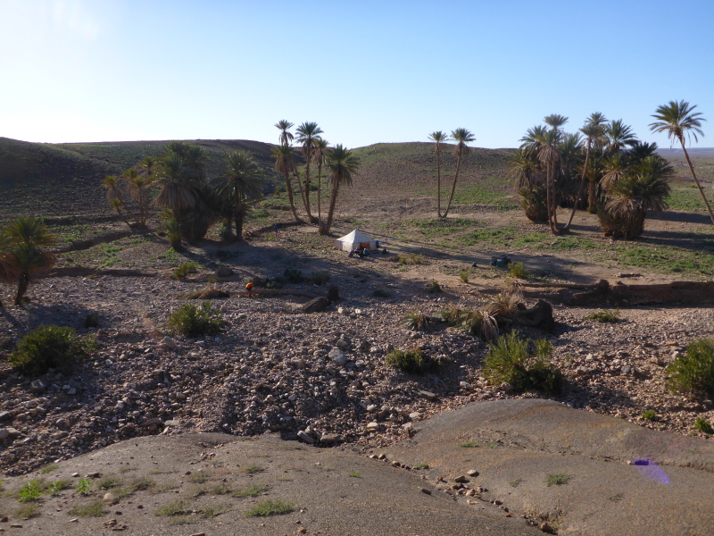 Samir hat die Gruppe in einem schnellen Laufschritt bereits verlassen, weil er sich um das Biwak und unsere dortige Ankunft kümmern muss. Lahcen und Lhoucine teilten sich nun die Aufgaben, Lhoucine ist meist vorne und zeigt uns den Weg und Lahcen folgt uns unauffällig mit seinem schweren Gepäck in der Hand. Bald schon erreichen wir das Biwak à l´Oasis Djabi.