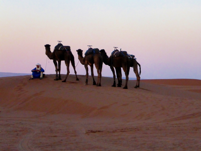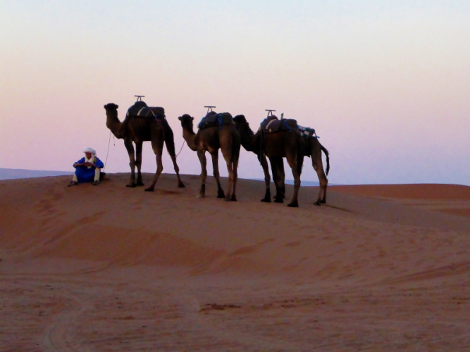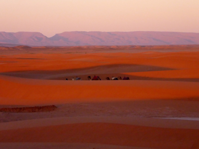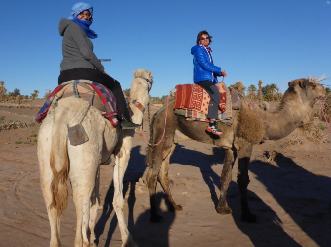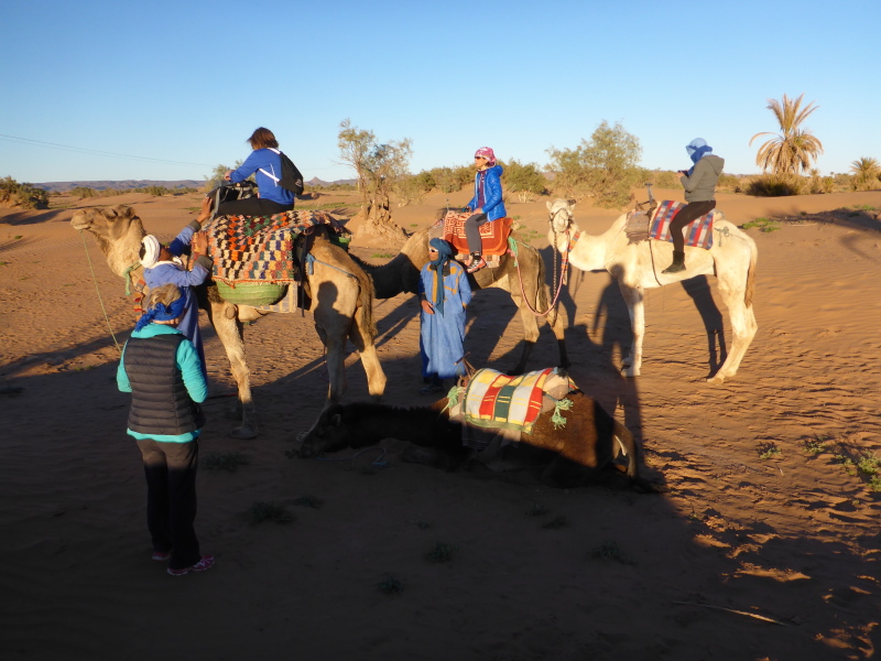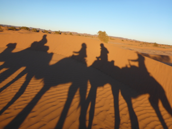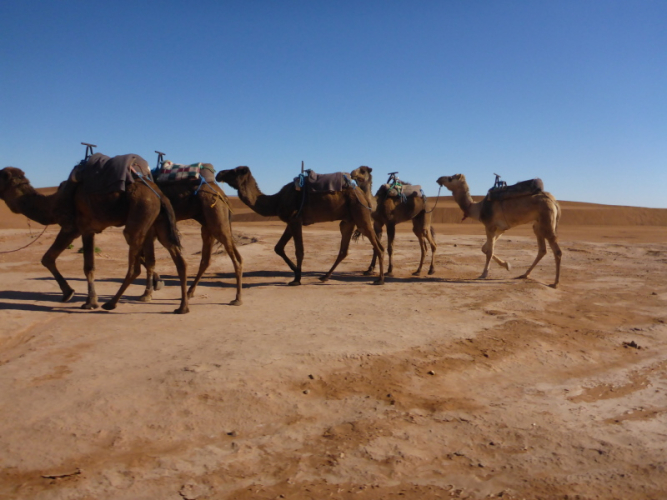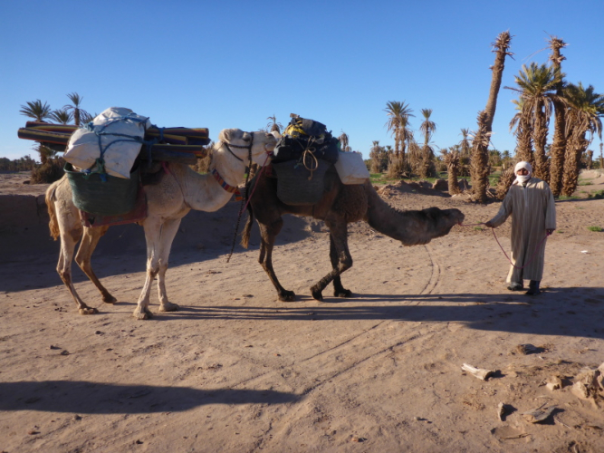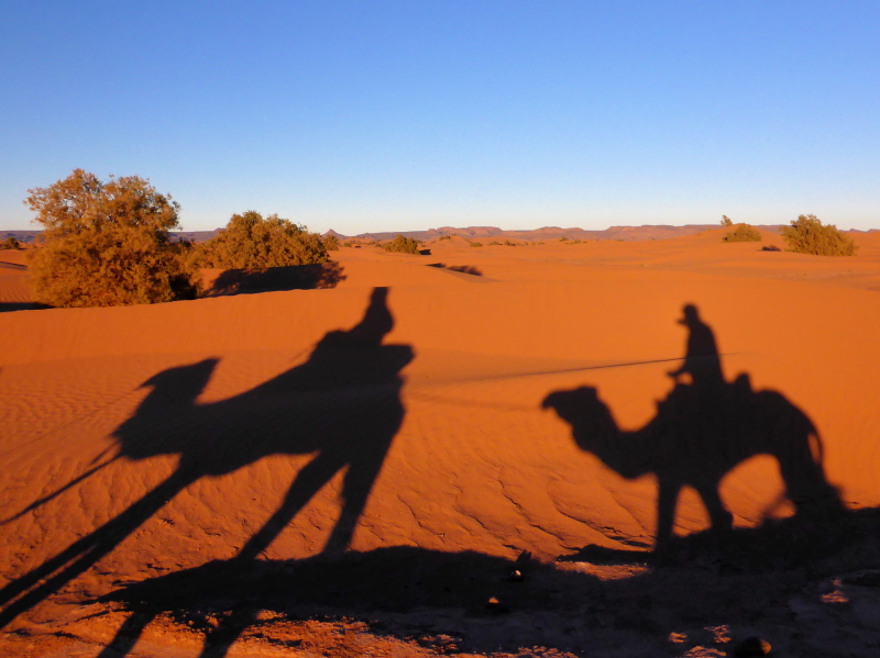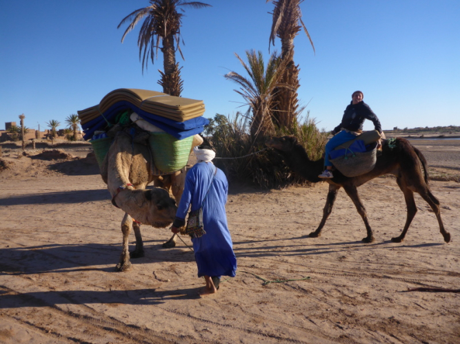 Mit dem gesamten Gepäck auf dem Dach des Geländewagens fahren dann auf Sand- und Steinpisten, manchmal auch querfeldein, in Richtung Mahamid zur Palmeraie de ouled-Driss. Dort bekommen wir Mittagessen, bevor wir Dromedaren in ein weiteres Biwak in den Dünen von Erg Lihoudi getragen, oder besser gesagt, geschaukelt wurden. Es ist lustig, auf dem Rücken eines Dromedars zu sitzen, aber Höhenangst darf man nicht haben. Ehrlich gesagt: Laufen finde ich aber trotzdem schöner!