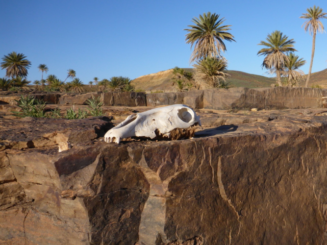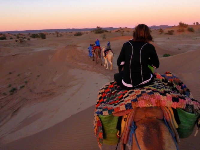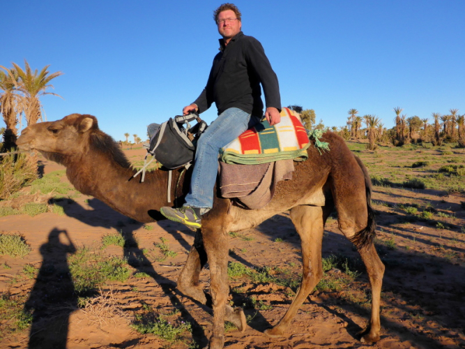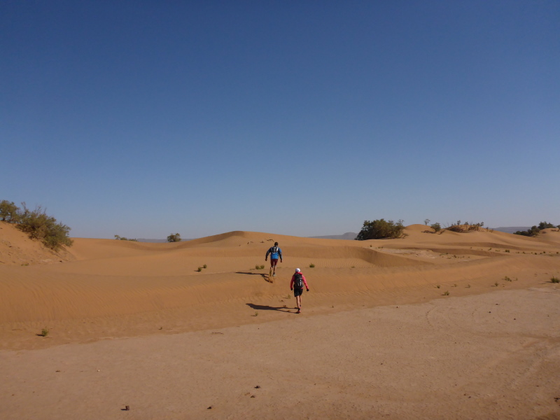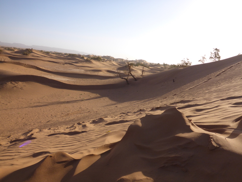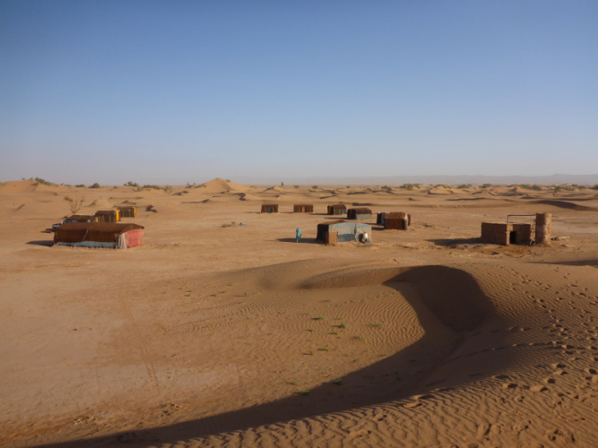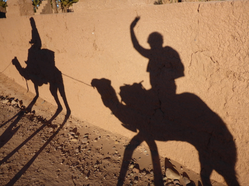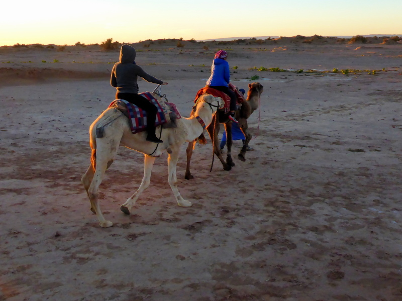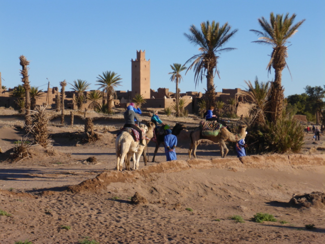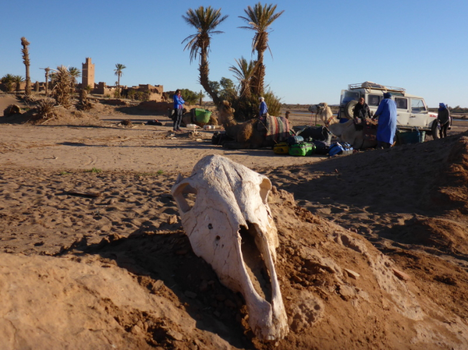Mit dem gesamten Gepäck auf dem Dach des Geländewagens fahren dann auf Sand- und Steinpisten, manchmal auch querfeldein, in Richtung Mahamid zur Palmeraie de ouled-Driss. Dort bekommen wir Mittagessen, bevor wir Dromedaren in ein weiteres Biwak in den Dünen von Erg Lihoudi getragen, oder besser gesagt, geschaukelt wurden. Es ist lustig, auf dem Rücken eines Dromedars zu sitzen, aber Höhenangst darf man nicht haben. Ehrlich gesagt: Laufen finde ich aber trotzdem schöner!