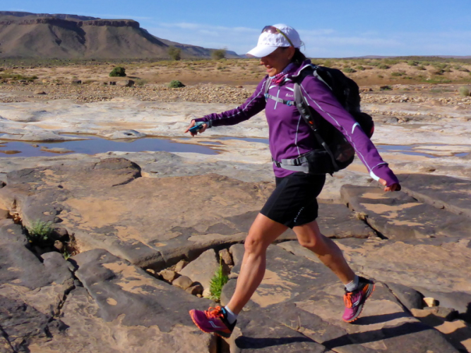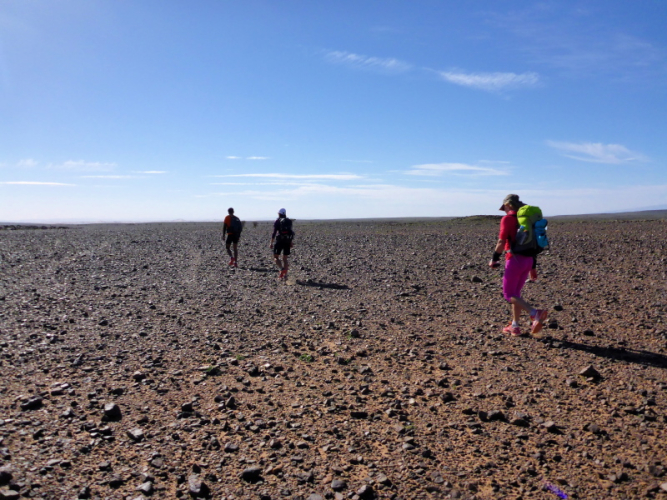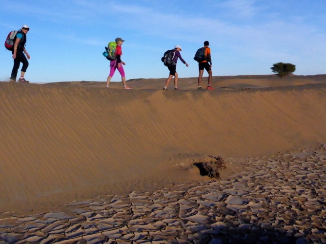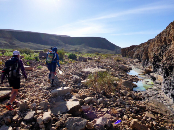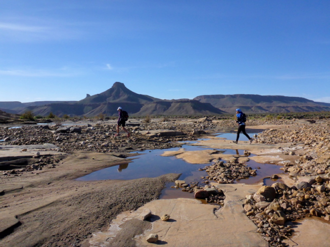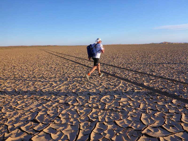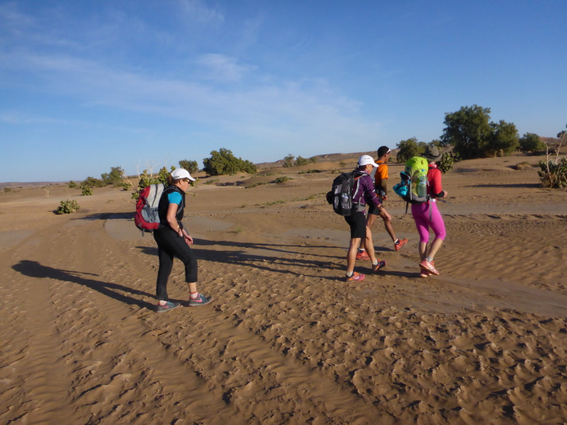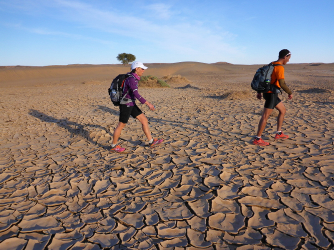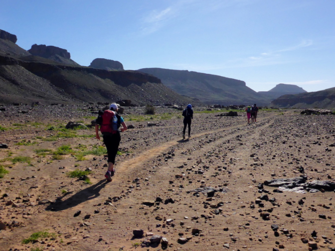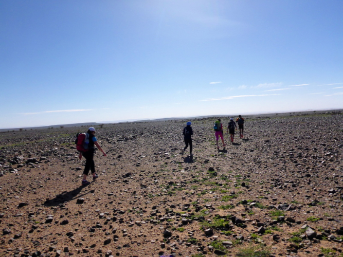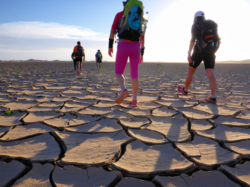 Allmählich lassen wir die Berge hinter uns und erreichen die Steinwüste Chegaga. Aus der Ferne konnten wir schon die hohen Sanddünen erkennen. Aber wie weit weg sie tatsächlich sind, können wir nicht abschätzen. Das Flussbett des oued Chegaga macht nicht viel Freude, das Laufen über die großen ausgetrockneten Sandplatten ist höchst anspruchsvoll, auch wenn wir sie liebevoll Schokoladenstücke nennen. Außer der Farbe haben sie wahrlich nichts mit der Süßigkeit gemeinsam. Es ist eher ein mühsames Unterfangen und nach der Anstrengung des Tages kein Laufgenuss mehr.