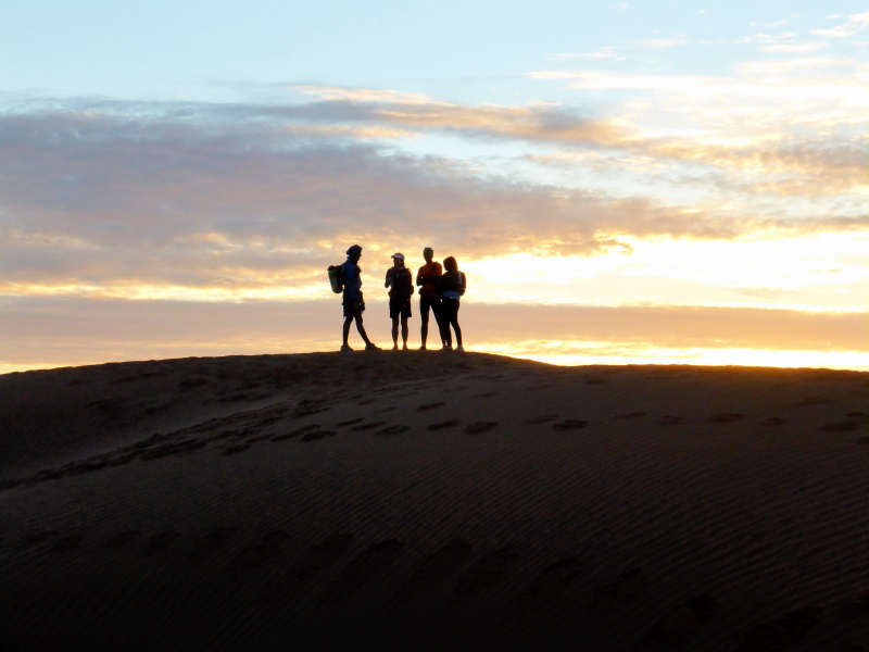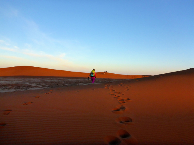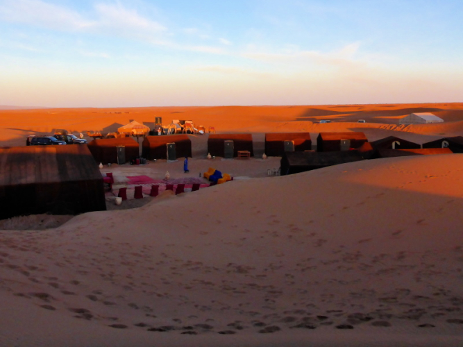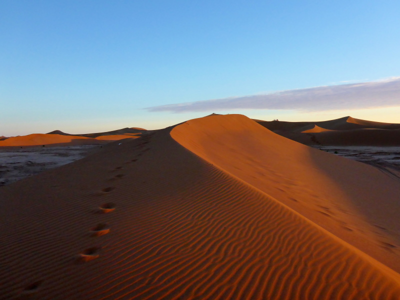 Irgendwann erreichen wir die Sanddünen von Chegaga und schon haben wir ein neues Problem: Der Sand in den Schuhen. Eine Sanddüne nach der anderen müssen wir überqueren, vorbei an anderen Biwaks, bis wir endlich das unsere erreichen. Die Dünen sind voller Menschen, um den Sonnenuntergang zu erleben. Es ist ja auch der Silvesterabend.