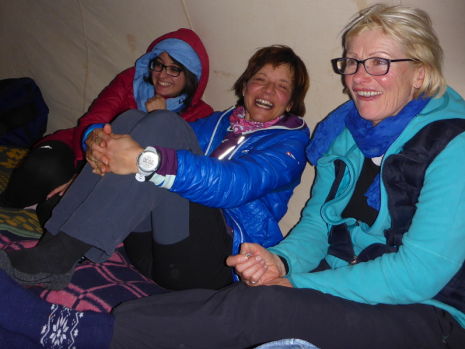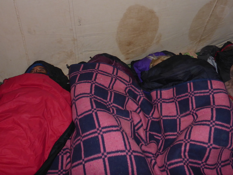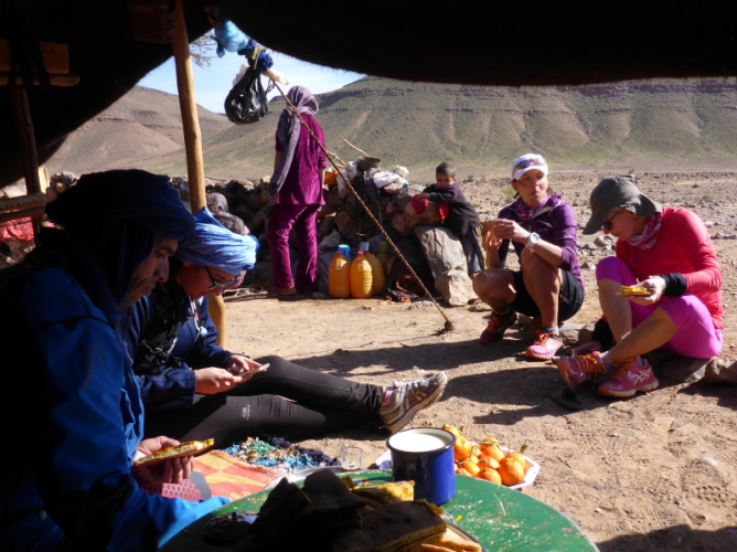 Für die Nacht haben wir zwei Zelte. Leider hat Lahcens Geländewagen eine Panne, so dass unser Gepäck erst verspätet eintrifft. Ich habe zum Glück alles Notwendige im Laufrucksack und kann gleich die warmen Duschen genießen. Schnell in die warmen Klamotten und zurück ins Biwakzelt.