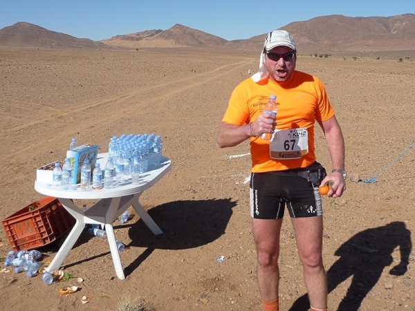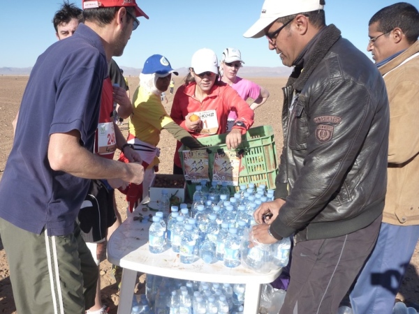 Bei km 6 die erste Verpflegungsstation: Datteln, Mandarinen, Zucker und Wasser, dann geht es bis zum Horizont, wo sich flimmernde Läufer mit der heißen Wüstenluft vermischen. So ziehen wir durch die endlose Geröllwüste, bis wir am Draa ankommen und eiskaltes, kristallines Wasser die Laufschuhe durchnässt.