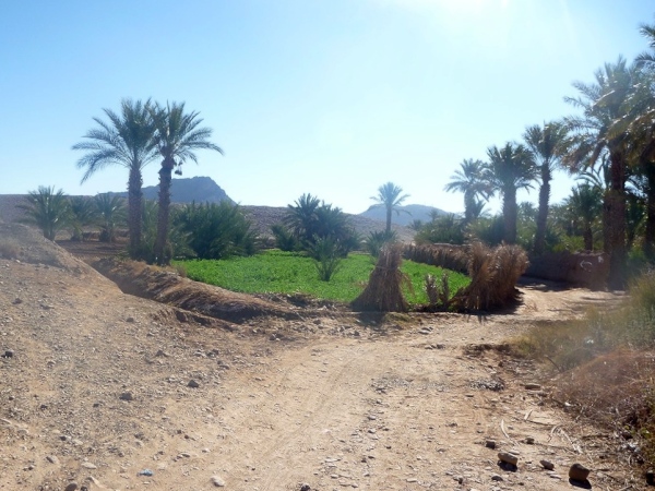 Kurz hinter der Marathonweiche in der Oase Ait Khadou nehmen Raimund und Gabi den falschen Weg. Gabi verpasst damit Platz 1. Aber egal, die Flussoase steht unter dem Schutz des Weltkulturerbes, muss man einfach gesehen haben. Dann geht es wieder hinaus, einfach weg von Allem. Polizeibeamte sichern noch den Rest Asphalt der Straße nach El Hamid, die irgendwann im Sande, kurz vor der verbotenen Grenze zu Algerien, endet. Dann ist absolute Ruhe.