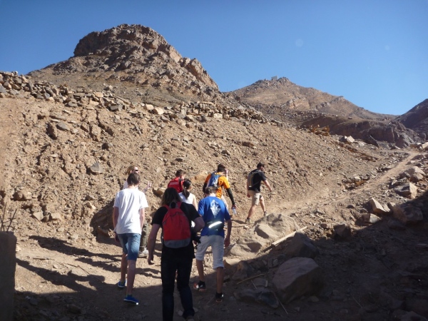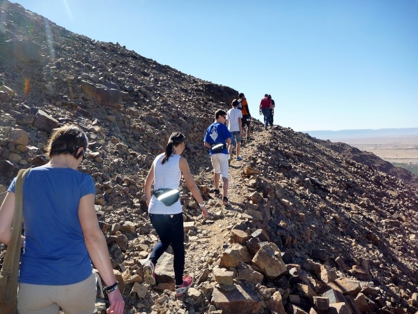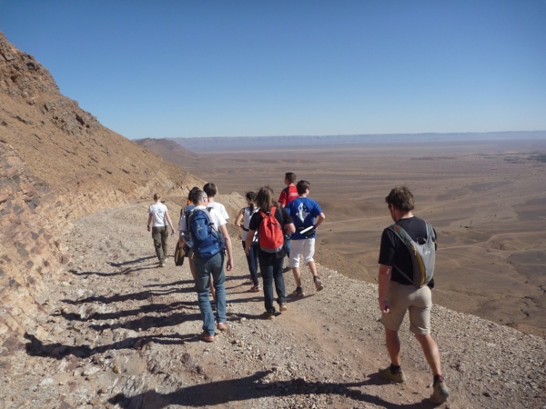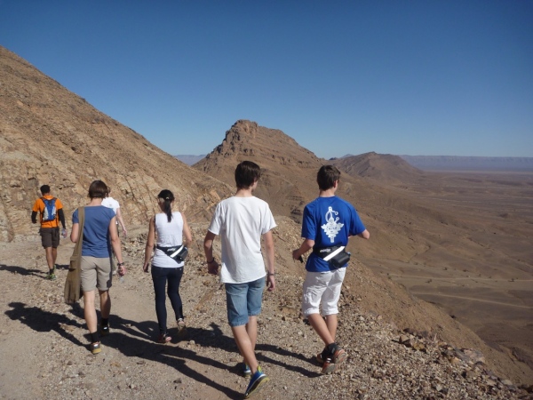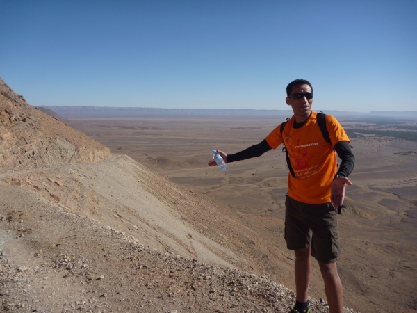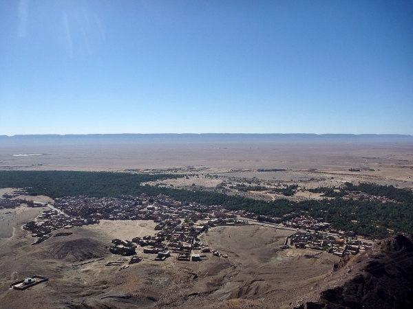 Vom Zagoraberg hat man einen Komplettblick über die Laufstrecke. Da erst kann man begreifen, wie weit dieser 42 km Kurs führt, nämlich in einem gewaltigen Kreis am Rande des Horizontes entlang. Der Aufstieg ist schwierig, der Blick der Lohn aller Mühe. Grandioses, schönes Land. Grandioser Marathonkurs. Lange stehen wir hier und analysieren die Laufstrecke. Lhoucine zeigt uns von hier oben die 65 km Strecke, die er, Lahcen, Rachid und Mohamad jeden Tag trainieren. Unterhalb, direkt am Fluss, sind Reste der mittelalterlichen Burg, die die Karavanenstraße überwachte.