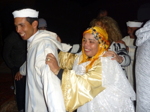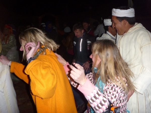 Die Tänzer stehen sich gegenüber und singen Lieder in einem fremden Berberdialekt. Die Männer eröffnen das Lied, die Frauen antworten. Wie alle Volkslieder handeln die Lieder von Mann und Frau. Mohamad übersetzt: “ Ich sah einen Vogel durch die Oase huschen…”, was mich stark an unser Lied “Kam ein Vöglein geflogen..” erinnert.