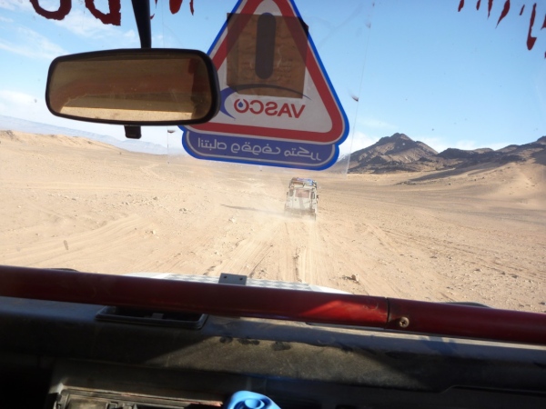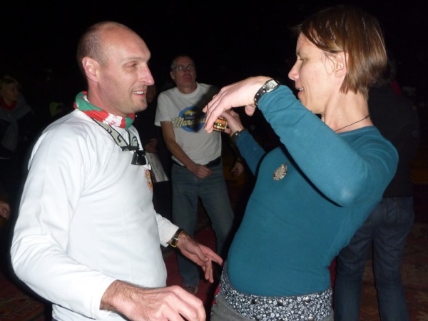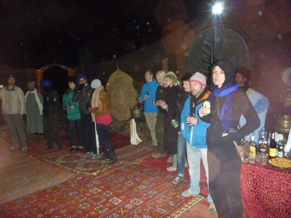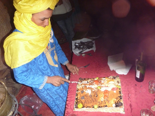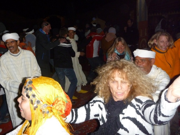Die Fahrt zur Silvesterfeier in der Sandwüste macht uns partykribbelig. Jeder der etwa 80 Gäste bekommt ein Zelt zugewiesen. Saubere weiße Laken auf Luxusbetten, elektrisches Licht, Sanitäranlagen mit fließendem Wasser (aus Hochbehältern), dicke Teppiche innerhalb der Zeltburg erleichtern das Gehen. Theoretisch sind je 4 Leute in einem Zelt untergebracht, doch die Nacht in der Wüste kennt eigene Zahlen, wenn die Orientierung nachlässt. Auch Robert findet sich wieder, als wir nach den Getränken aus seinem Rucksack suchen.