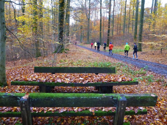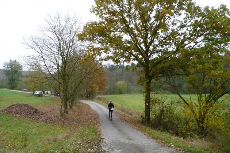 Wem ein Marathon zu lange und zu schwer ist (er hat immerhin 840 Höhenmeter auf zwei Runden), der kann sich beim Halben (eine Runde) oder als (Nordic-)Walker auf 21 oder 7,5 Kilometer einschreiben lassen. Die Startzeiten sind so gelegt, dass sich die einzelnen Felder nicht ins Gehege kommen. Wir starten um 10.00 Uhr, die Halbmarathonläufer (stärkste Gruppe) eine Stunde später. Die Strecke verläuft fast ausschließlich im Wald, nur wenige Meter sind auf einer Landstraße zurückzulegen. Die Waldwege sind meist gut befestigt, lediglich das verwitterte Laub sorgt für Schlammspritzer an den Läuferwaden. Mit fast 700 Teilnehmern auf den beiden Laufstrecken ist man höchst zufrieden.