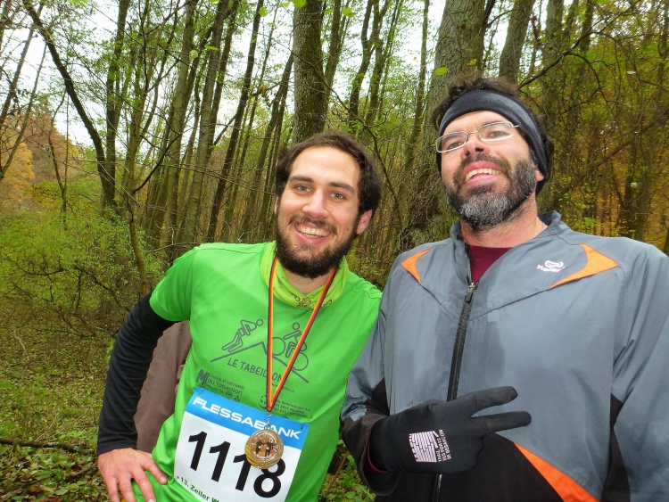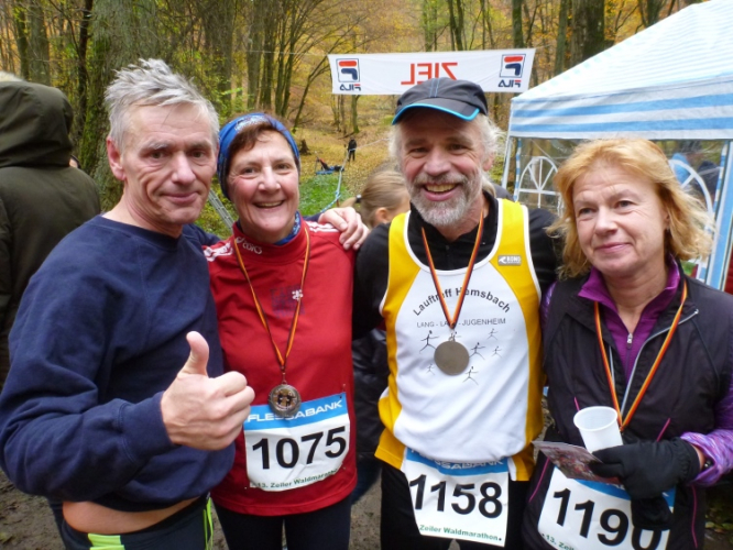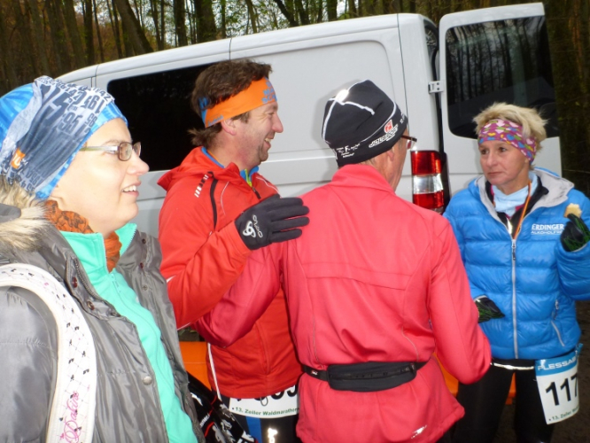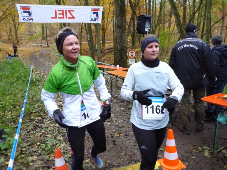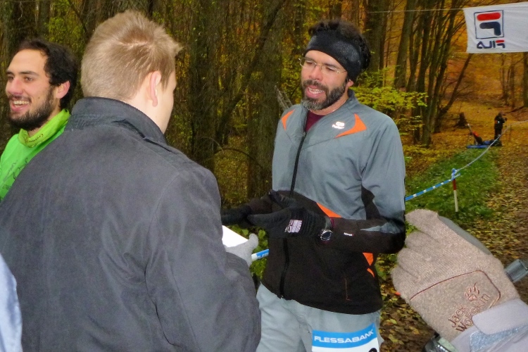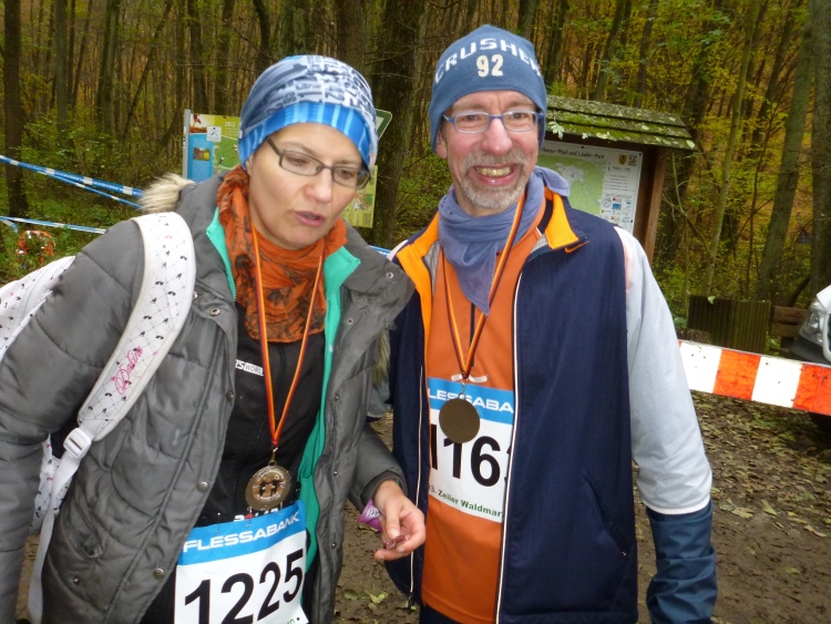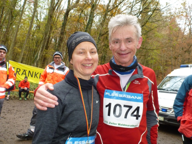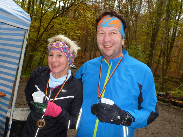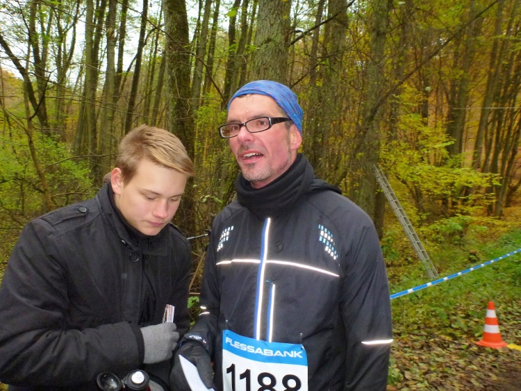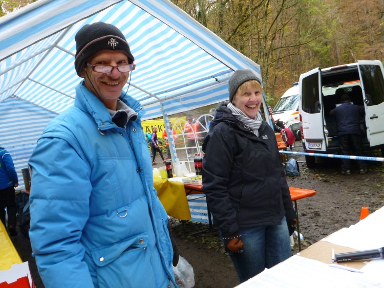 Ich hole mir dann eine dicke Jacke aus dem Umkleidezelt und damit gehe ich wieder auf die Strecke. Marion Häusers Daumen zeigt nach oben, sie ist bei ihrer Premiere auf der Distanz erfolgreich. Eine eigene Geschichte kann Anton Luber erzählen. Als Blinder ist er immer auf eine Begleitung angewiesen. Heute musste er auf Roland Blumensaat verzichten, er musste vor der zweiten Runde das Rennen abbrechen. Cornelia Schmutz, die Hemsbacherin, stellte sich als neue Begleitung zur Verfügung und brachte den Anton ins Ziel. So haben sich zwei auf der Strecke gefunden und sich nicht unterkriegen lassen. Toll.
