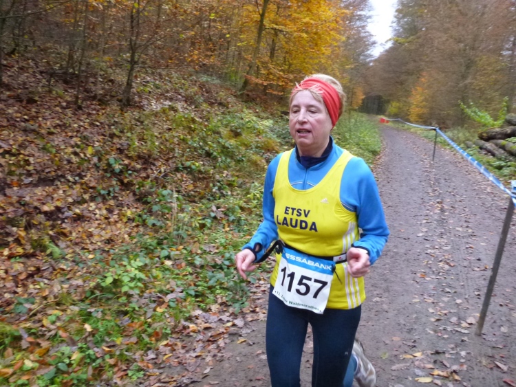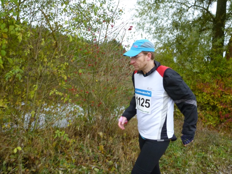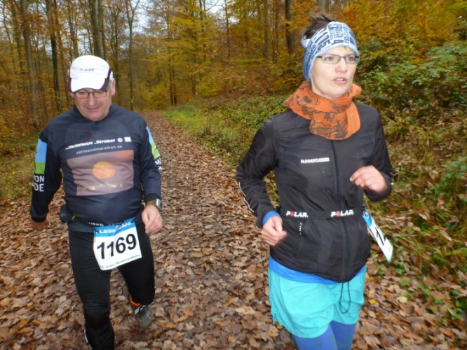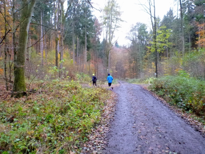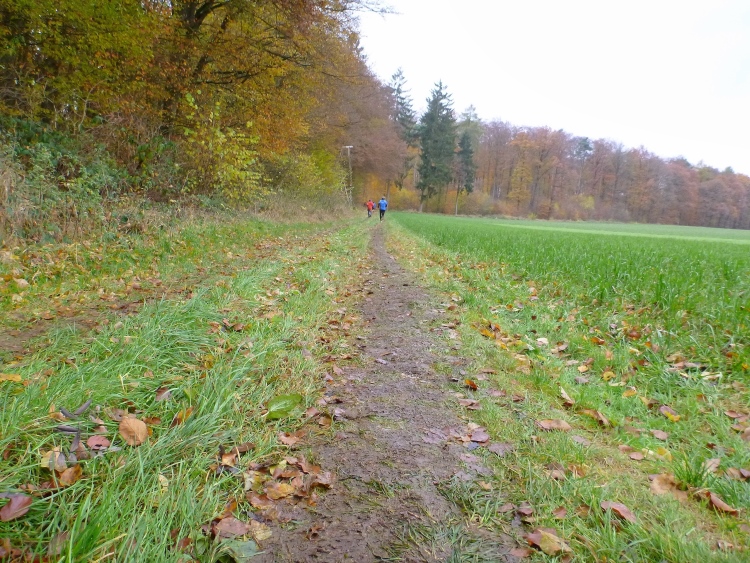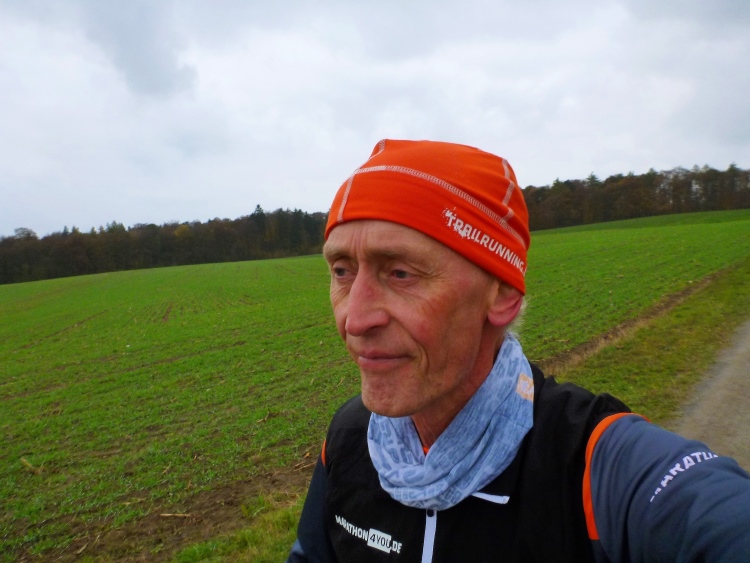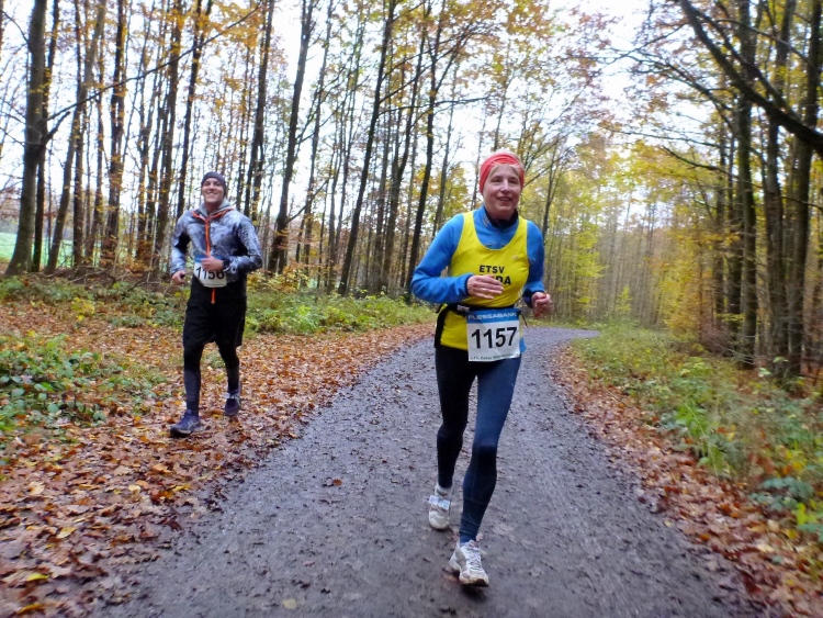 Dann kann ich auf Roland Krauss an dem Gegenanstieg auflaufen. Er geht. Beim Indoormarathon hat er mir fünf Runden abgenommen. Heute macht er sein Rennen gemütlich. Kurz danach laufe ich wieder auf Hubert auf, der mittlerweile mit Petra Zehnter läuft. „Pass auf, ich hole dich noch ein,“ meint er, als ich beide überhole.