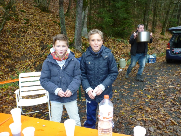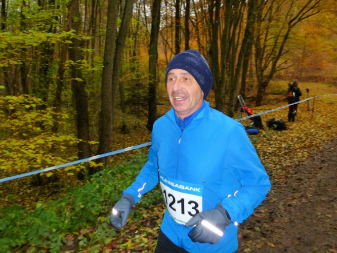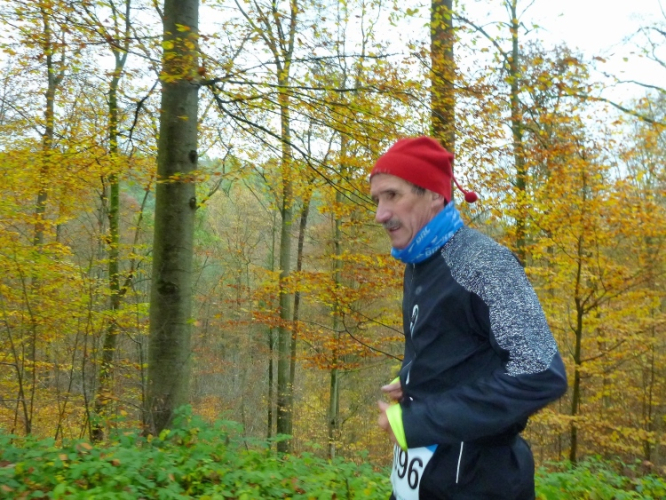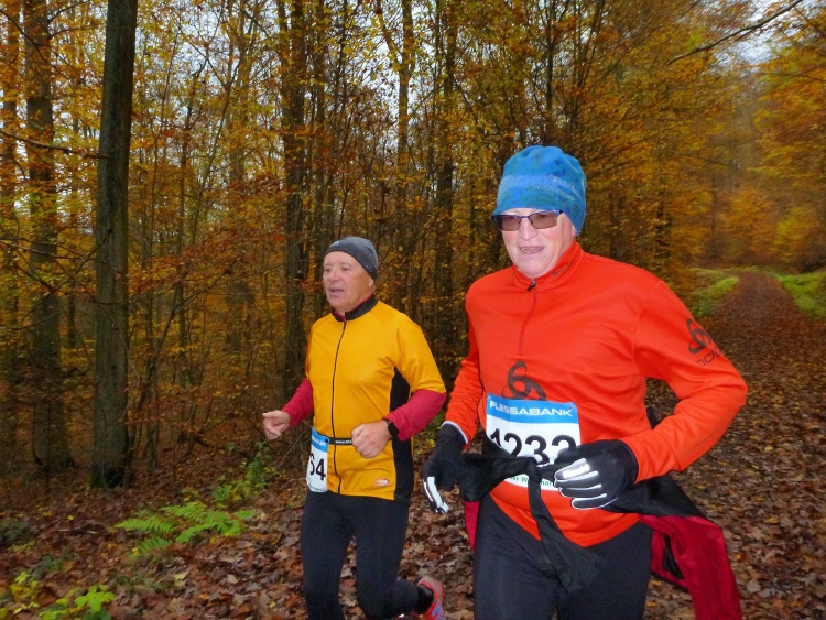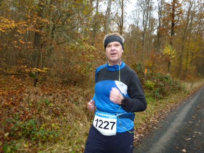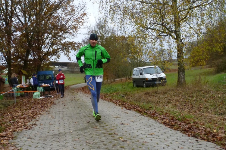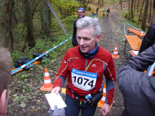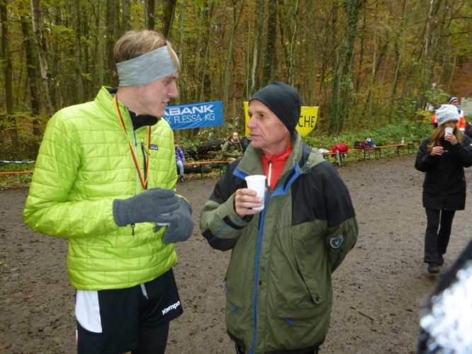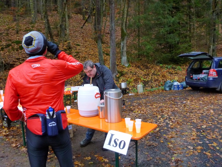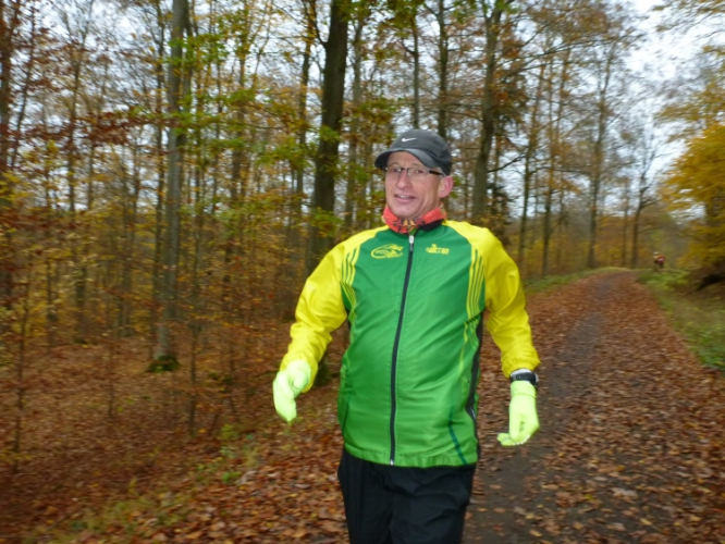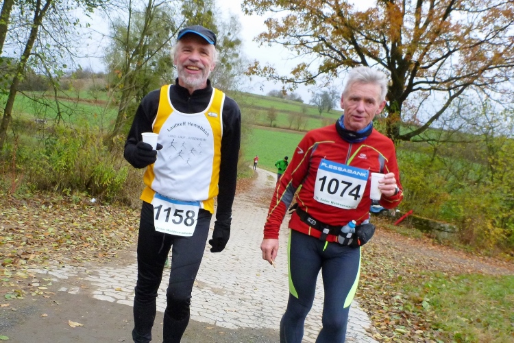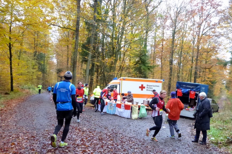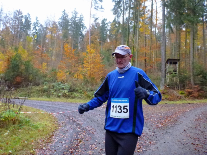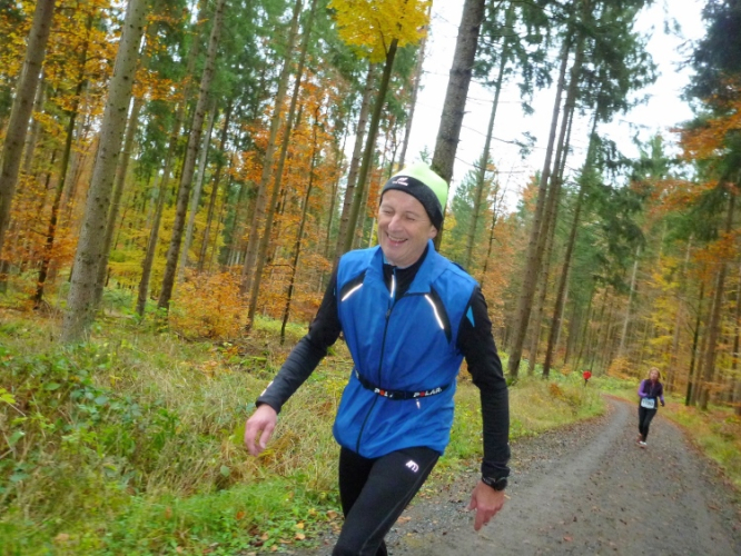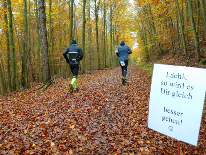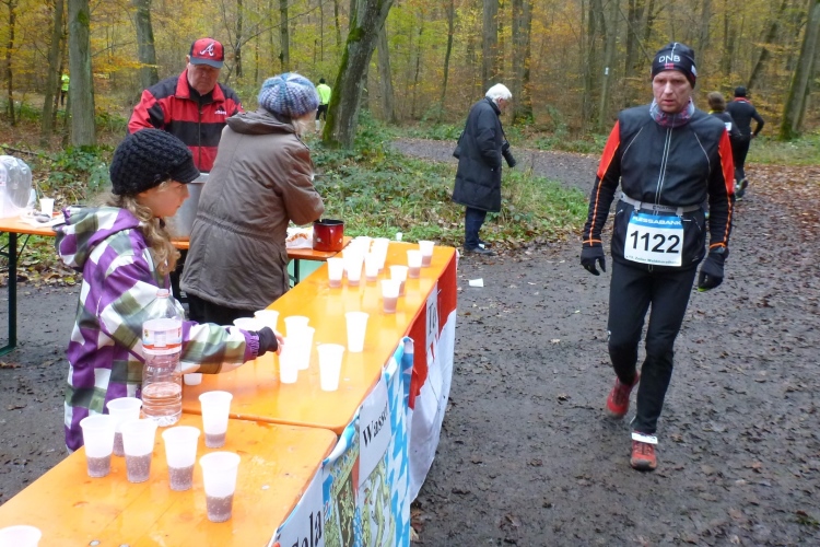 Kilometer 18, bald endet die erste Runde. Wir erhalten die Höhenmeter von der ersten langen Steigung in Dosen zurück. Es warten auf den drei Kilometer hinunter zum Setzbachbrunnen noch zwei, drei kleine Anstiege. Kurz nach der Markierung 18 laufe ich auf den Chef Hubert Karl höchstpersönlich auf. Er ist stolz auf seine Helfer, die mit Engagement für das Gelingen der Veranstaltung beitragen. Der Hubert hat vor rund 20 Jahren die Abteilung gegründet. Viele aus dieser Zeit sind noch dabei, wenn es ums Laufen und Organisieren geht, sei es in der Halle, am Start und Ziel oder draußen auf der Strecke.
