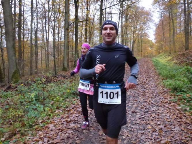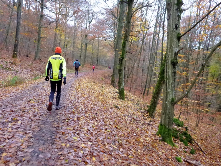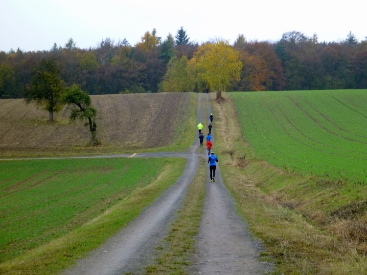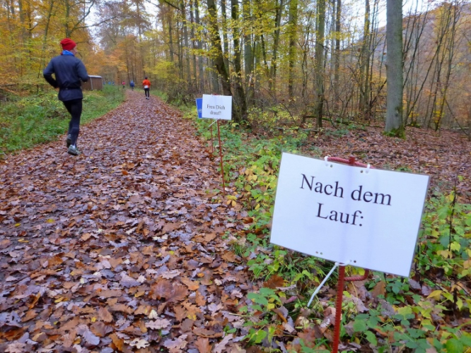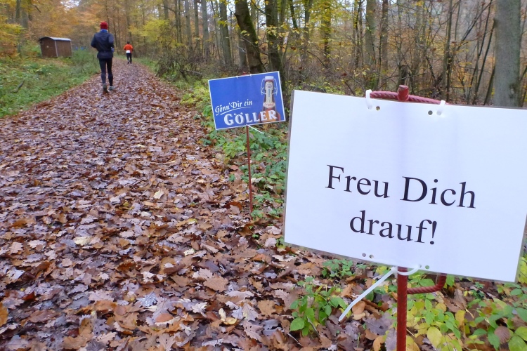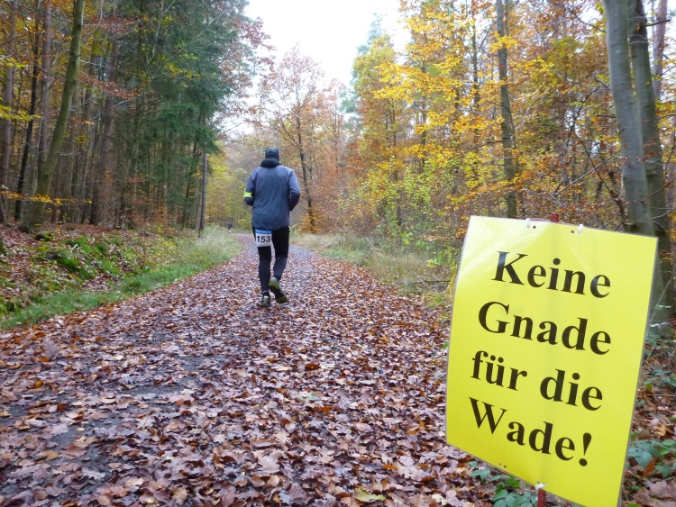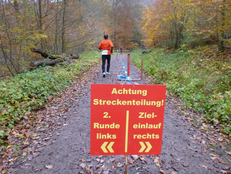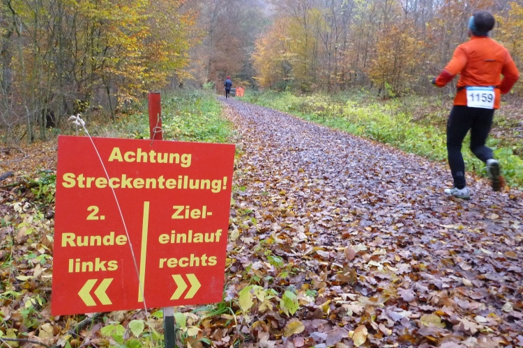 Vielleicht 200, 300 Meter laufen wir auf der Kreisstraße und dann geht es rechts wieder in den Wald, wo uns die Masse der Halbmarathonläufer entgegenkommt. Einen knappen Kilometer lang ist die Begegnungsstrecke. An der ersten V-Stelle müssen wir links weiter.