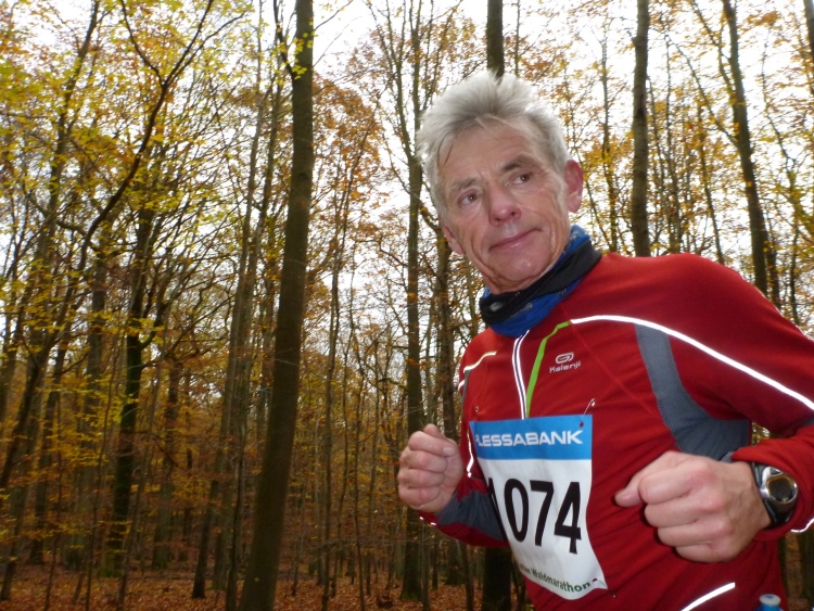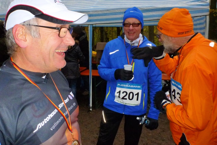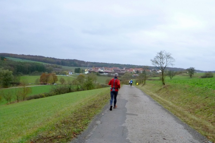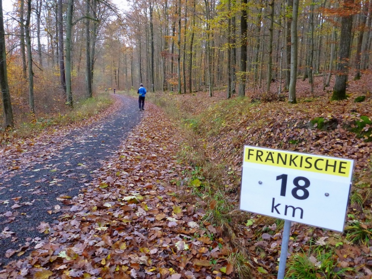 Christoph Höger, einer aus der Region, läuft hier seinen zweiten Marathon und will nur durchkommen. Seine Premiere feierte er in Frankfurt vor zwei Wochen in 3.45 Minuten. Er spekuliert, auf seinen Chef aufzulaufen, der 100 Meter vorne ist. An Robert Willinger erinnere ich mich nicht, aber er sich an den laufenden Reporter. Wir haben uns vor ein paar Jahren beim Frankenweg einen Abstecher bei Gößweinstein gegönnt und uns zwei Kilometer verlaufen. Das hatte ich schon noch im Gedächtnis. Ich bin gespannt, ob der Jungspund Christoph seinem Boss die Hacken zeigen kann.