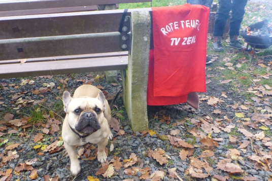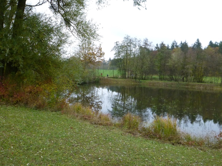 Bernhard Hertinger, der Hemsbacher, läuft heute auch ein starkes Rennen. Er schaut sich aber laufend um, ob seine Madame (die Andrea) noch zu sehen ist. Ich gehe an ihm an der V-Stelle am Bischofsheimer Weiher vorbei. Dort freut sich der Hund über eine Krauleinheit von seinem Frauchen. Der Hund jault und liegt vor Entzückung am Boden wie ein Zementsack.