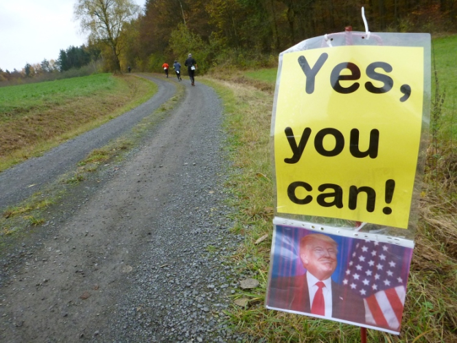 Kilometer 14, am See eine weitere V-Stelle. Fast glaube ich, dass es unter denen einen Wettbewerb gibt, wer die umfangreichste Versorgung darbieten kann. Vorher gab es hausgemachten Kuchen, nun steht zusätzlich Malzbier auf dem Tisch. Und beim Weggehen verdrücke ich noch einen Negerkuss. Kennt Ihr? Als Kind hat man die Süßigkeit auch Mohrenkopf genannt. Beide Begriffe sind heute nicht mehr salonfähig. Kurz nach dem See sehe ich ein weiteres Schild: „Yes you can!“ dazu ein Bild des künftigen US-Präsidenten. Eine leichte Unverträglichkeit zwingt mich dann in die Büsche, einige Marathonis können mich wieder passieren.