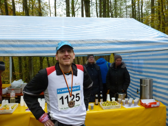 Nach einer kurzen Versorgung mache ich mich wieder auf den Weg. Hubert steht im Zielbereich und unterhält sich mit seinen Leuten. An der langen Steigung hat sich das Marathonfeld nun wirklich weit auseinandergezogen. Einige vor mir sind am Marschieren, ich kann noch laufen. Dann kommt einer leichtfüßig von hinten heran: Der Hubert! „Hier habe ich laufen gelernt,“ sagt er noch und lässt mich stehen. Ich staune. Nicht umsonst wurde der smarte Ultraläufer vor zwei Jahren zum Sportler des Jahres in der Region gewählt. Ja, und ein Kostverächter ist der Hubert auch nicht, holt er sich die wichtigen Vitamine am liebsten mit einem Weizenbier von Göller.