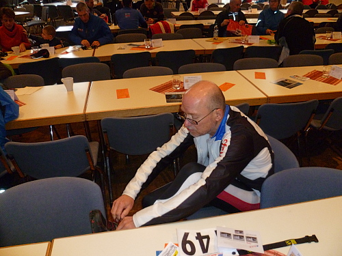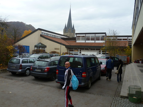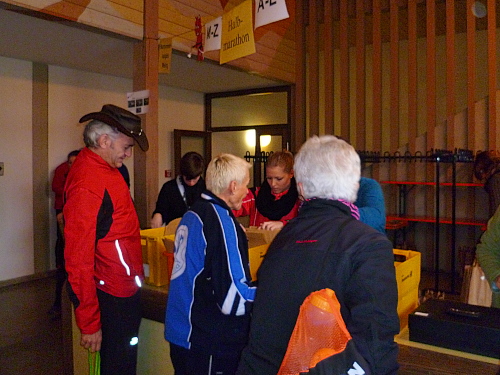 Leider haben wir gerade keinen Sinn für die romantischen Gässchen, die uns um dieses eindrucksvolle Bauwerk herumführen. Gleich hinter der Kirche ist eine Halle. Das überproportional häufige Auftreten von Menschen in Laufklamotten lässt uns aufatmen. Schnell finden wir den Eingang. Nachdem das Dringlichste erledigt ist, können wir uns mit den Startunterlagen beschäftigen. Diese gibt es gleich im Eingangsbereich. Dazu erhält jeder eine schwere Tüte, gefüllt mit einer Flasche alkoholfreiem Weizenbier und einer Flasche Mineralwasser. In der Halle sind fast alle Plätze belegt. 1000 Läufer und Walker werden bei den verschiedenen Wettbewerben starten. Trotz der versetzten Startzeiten sind scheinbar schon alle da.