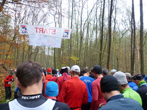 2 Minuten nach dem offiziellen Start um 10 Uhr erreichen wir das im Wald aufgespannte Startbanner. Hier wartet das ganze Läuferfeld, um loszulaufen. Gerade wird erklärt, dass erst in 5 Minuten gestartet wird. Man hat hier scheinbar Erfahrung mit verspäteten Läufern. Erleichtert können wir unsere Taschen im bereitstehenden Sanitätszelt unterbringen.