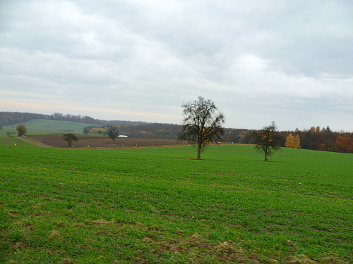 Wir sind auf freiem Feld. Norbert verabschiedet sich und läuft nach vorne. In der Ferne sieht man Bischofsheim. Plötzlich geht es scharf rechts. Nach einem kurzen Gefälle führt uns ein frisch geschotterter Feldweg wieder bergauf Richtung Wald. Ein paar hundert Meter am Waldrand entlang, scharf links und wir sind wieder im lichten Wald.