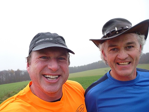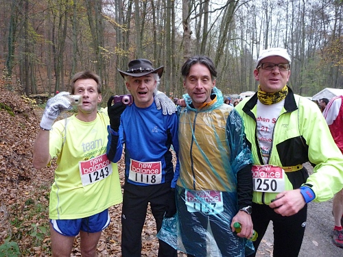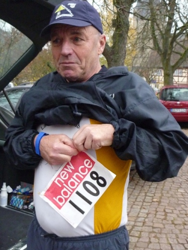 Wenn von einer „anspruchsvollen Strecke“ (840 HM) die Rede ist, dann kann ich nur lachen. Denn wir sind auch sehr anspruchsvoll und dankbar, daß einer der größten Ultraläufer den Marathon organisiert und auch gleich noch mitläuft. Es gibt nur einen Menschen, der 15mal den Spartathlon (245 km) gefinisht hat. Und das ist Hubert Karl. Er kommt auf über 650 Marathons und mehr, darunter  2 mal Peace Run Hiroshima (457 km), 5 mal Japandurchquerung (250km), beim Badwater hält er den Deutschen Rekord. Hubert ist Lauftrainer und –therapeuth und kümmert sich um den Läufernachwuchs, die „Roten Teufel“. Ob Straßenläufe, Leichtathletik oder Crossläufe - überall sind die "Roten Teufel" zu sehen. Willkommen als teilnehmerstarke Gruppe, aber auch gefürchtet wegen ihrer guten sportlichen Leistungen. Heute stehen die „Roten Teufel“ an den Verpflegungspunkten und helfen bei der Organisation mit.