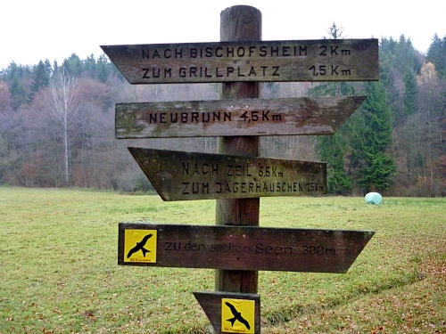 Es geht oder besser läuft über den Schlossberg und die Bischofsheimer Höhe, mit den Dreiländerstein. An den Fischteichen vorbei weiter Richtung Jägerhäuschen, alles gut laufbare Wege. Das Laub ist dieses Jahr trocken, keine Steine oder Äste, die den Lauf behindern würden. Durchhalteparolen auf den Schildern geben die einzigen Fotomotive. Einige wenige Halbmarathonläufer ziehen vorbei.