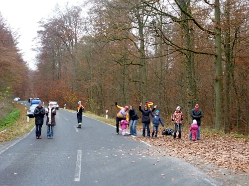 Die zweite Runde wird ruhig, der Wald ist schon im Winterschlaf. Die Müsliriegel und den warmen Tee lasse ich liegen, denn Kuchen und alkfreies Bier laden zum Verweilen ein. Einige Scherze mit den Roten Teufeln und weiter geht es. Ich entdecke einige alte, stillgelegte Hohlwege und träume von den uralten Handelsstrassen (wen es interessiert, es ist die B 279).