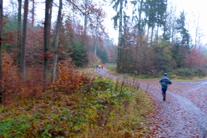 Die dritte lange Steigung lässt sich eigentlich gut belaufen: 80 Höhenmeter auf rund drei Kilometer. Im kurzen Gegenverkehrsbereich östlich von Bischofsheim nimmt die Steigung leicht zu. Hier sehe ich die Spitze des Marathonfeldes, die haben schon gut drei Kilometer mehr zurückgelegt. Die drei Helfer vom BRK weisen uns den Weg, rechts ab wieder in den Wald. Und jetzt wird die Strecke glitschig und tief, da bräuchte es fast Spikes, um nicht auszurutschen.