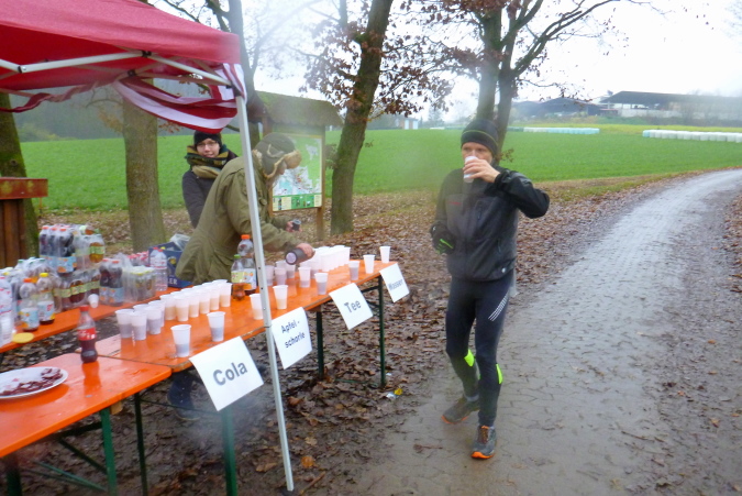Kurz nach Kilometer vier auf bestem geschotterten Untergrund wartet die erste Trinkstelle. Wasser, Tee, Iso, Cola und auch etwas zum Beißen warten auf uns. Nach einem Stückchen Kuchen und angewärmten Tee mache ich mich auf den weiteren Weg. Die 7,5 Kilometer-Strecke zweigt hier rechts ab.