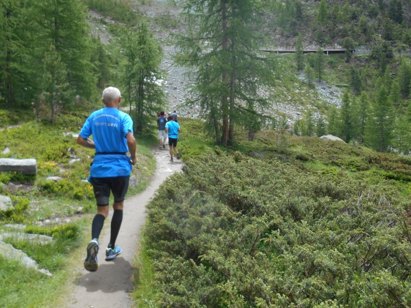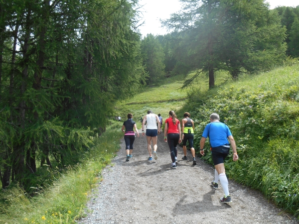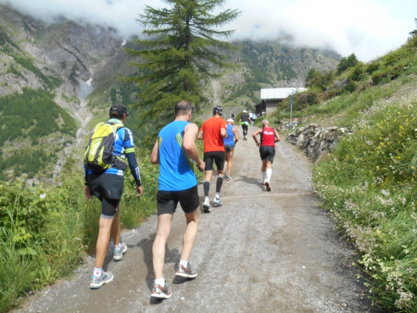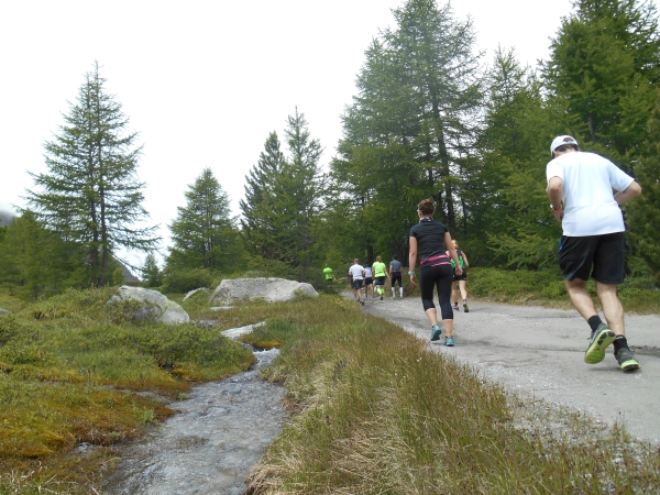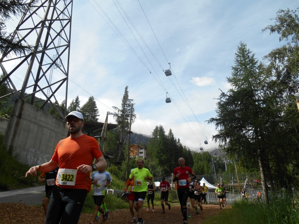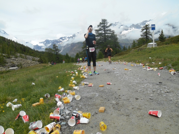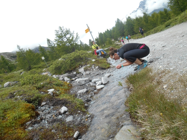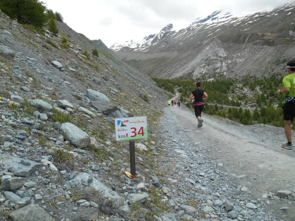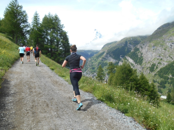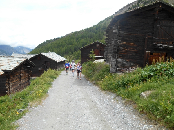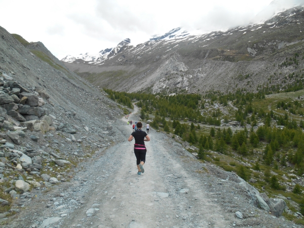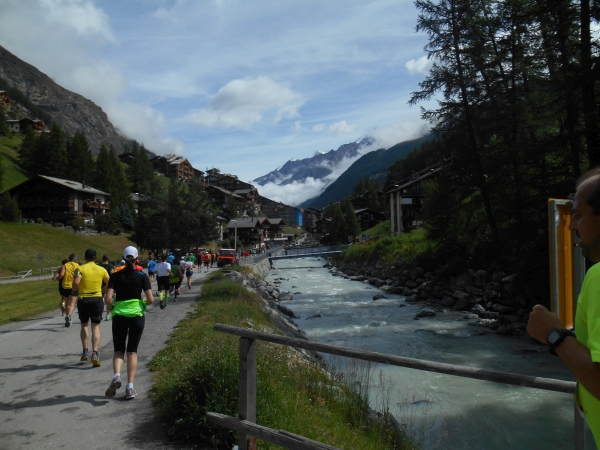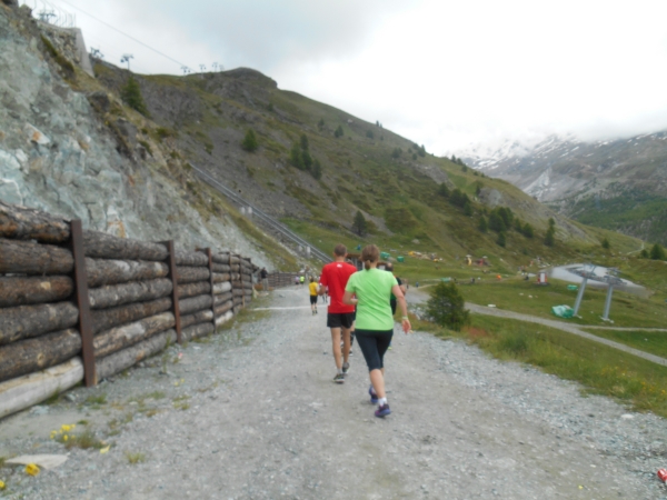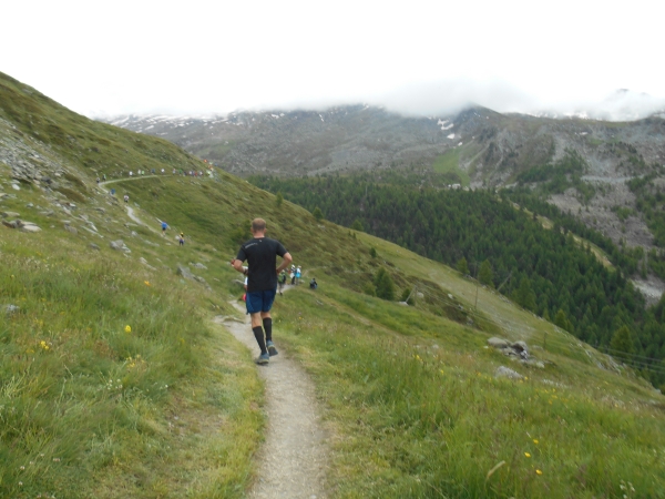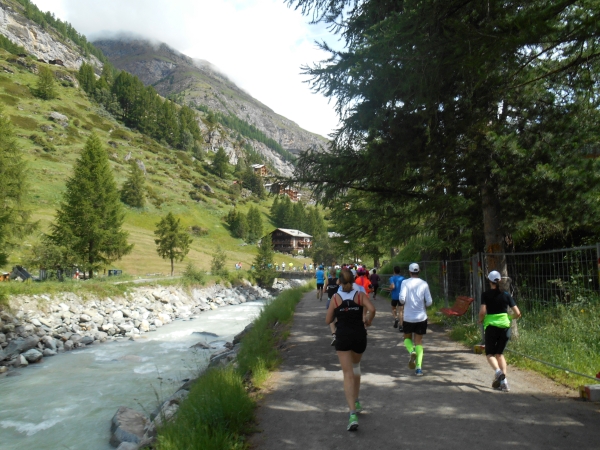 Nach einer kurzen Schleife aus der Stadt raus, unter der Seilbahn durch und über eine Brücke, laufen wir entlang des Matter Vispa zurück in die Stadt. Nach der ersten Verpflegungsstelle biegt die Strecke nach rechts ab und wo der Asphalt endet, beginnt der erste Anstieg. Das Läuferfeld dünnt sich aus und die Gespräche werden einsilbiger. Als wir den zweiten Verpflegungspunkt erreichen, bin ich schon halb verdurstet. Ob das an der Höhe liegt oder daran, dass ich, ohne ein Ende zu finden, Christian von meiner fast 20jährigen Skifahrerkarriere erzähle, kann ich nicht sagen. Die große Auswahl an Getränken und kalorischen Snacks kommt da gerade richtig.