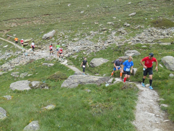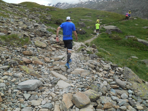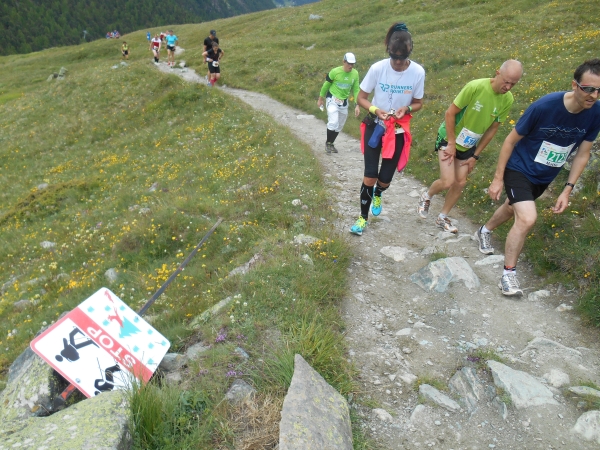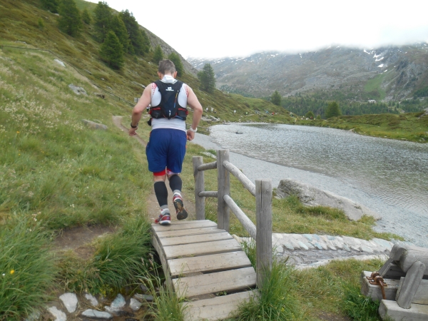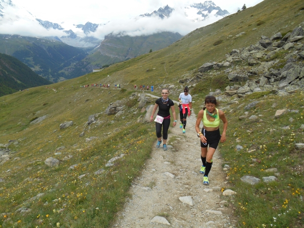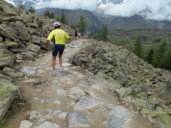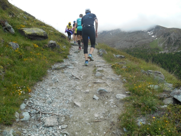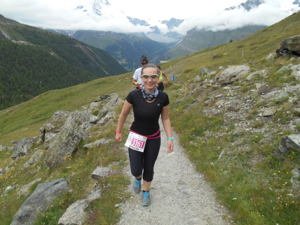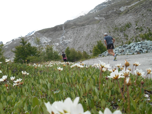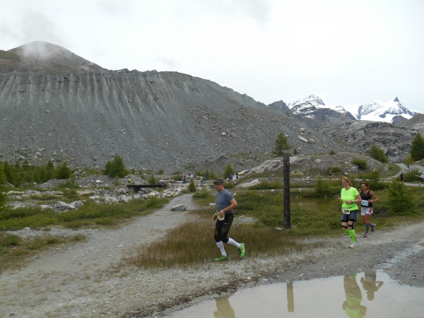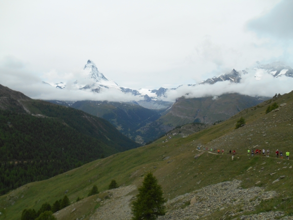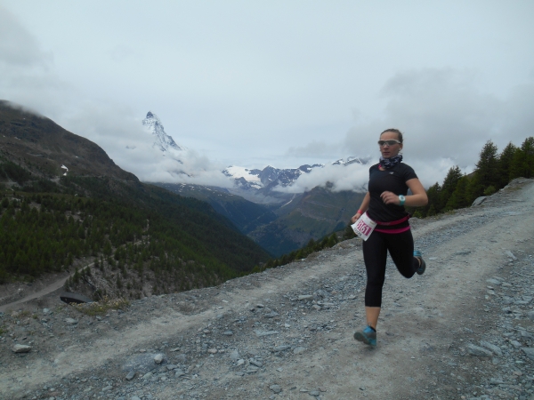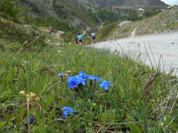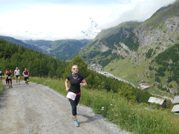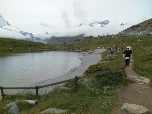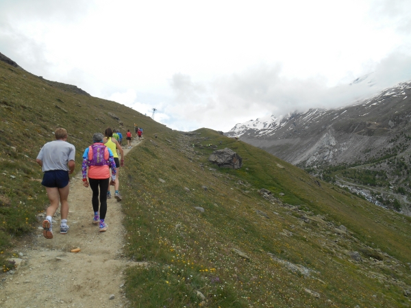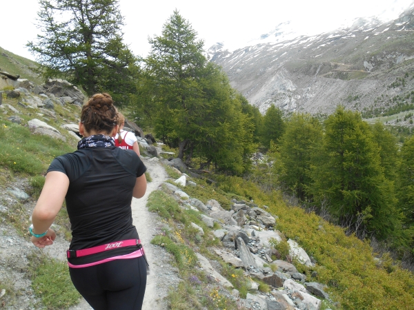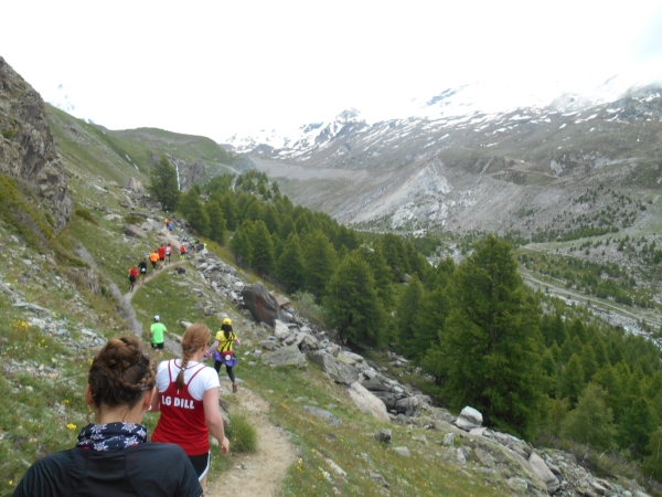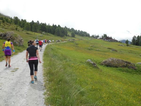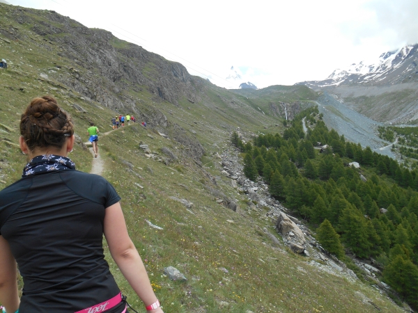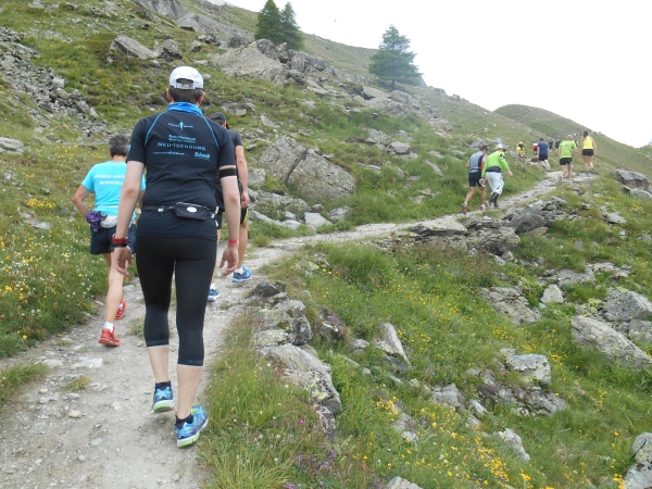 Die Luft wird dünn, die Waden dick. Ein Sturz wäre jetzt wirklich blöd. „Links!“, ruft es von hinten und ich springe zur Seite. Schon lange sind wir nicht mehr nur noch von pinken Nummern umgeben, denn hier auf den schmalen Wegen und an den steilen Hängen werden wir jetzt von den roten Nummern „eingesammelt“. Die roten Nummern werden von Ultraläufern getragen. Und diejenigen, die uns hier gerade überholen, haben nicht nur bereits mehr als unsere Gesamtstrecke in ihren sehnigen Beinen, sondern werden ihr Ziel am Gornergrat (nach insgesamt 46km) voraussichtlich auch erreichen, bevor wir am Riffelberg ankommen - Da genieß ich doch lieber die Landschaft!