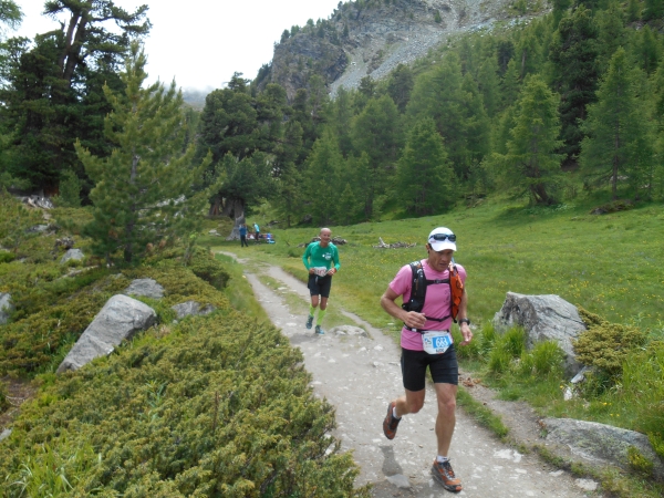Über kleine Holzbrücken geht es über Bäche und über Geröllpisten und Felsbrocken wieder hinein in duftende Pinienwälder. Unsere Vorbereitung in Bezug auf die Höhe war schon etwas dürftig, aber was sich in Berlin als „Trail“ verkaufen lässt, ist hier tatsächlich nicht mehr als ein alpin-urbaner Vorgarten. Langsam wie der Internetexplorer mit einem 90er Jahre Modem laufen wir der Riffelalp auf 2222m entgegen. Direkt nach einem Buffet vom Verpflegungsstand (mit einem Energy-Potpourri aus dem Hause PowerBar, sowie Cola, Tee, Iso und Suppe) biegen wir, begleitet von einer Kapelle, hinter der Riffelalp auf den letzten Anstieg ab.