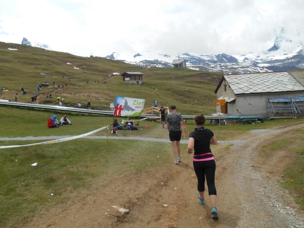 Bevor wir den Riffelberg erreichen, passieren wir sogar den letzten Rest Schnee. Die letzten 600m verlaufen auf schmalen, mit kleinen Schweizer Fähnchen geschmückten Wegen auf dem Riffelberg, umgeben von den 29 Viertausendern. Und während Christian und ich das Ziel nach 3:40h erreichen, denke ich an meine Mama, die immer noch gegen den Berg kämpft. Von unserem Ziel aus hat sie noch weitere 3,5km mit weiteren 500HM bis zu ihrem Ziel am Gornergrat.