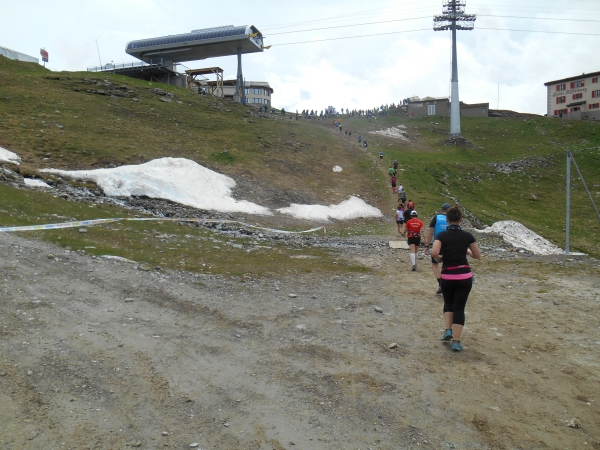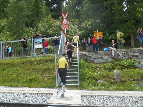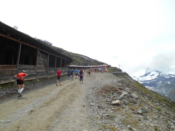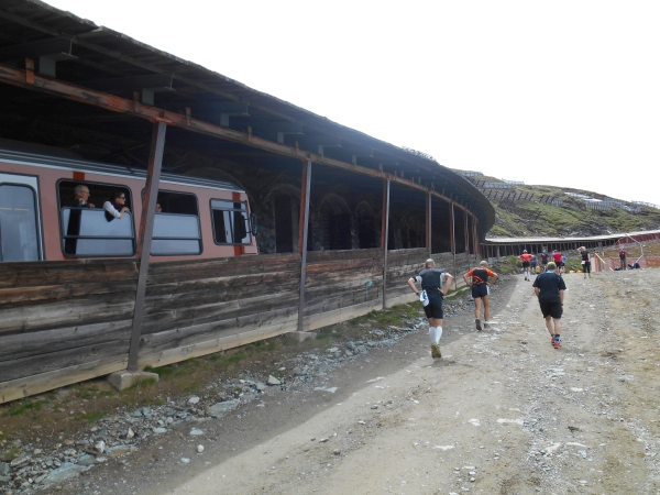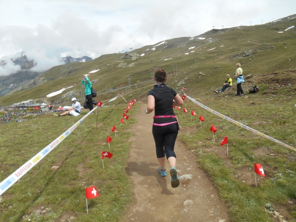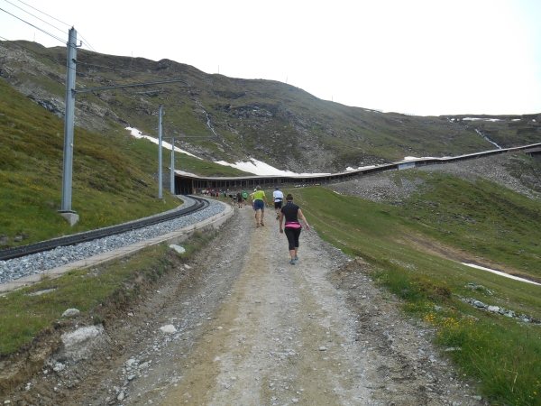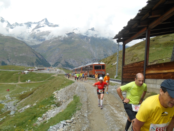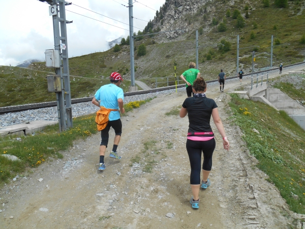 Ab hier beginnt die harte Arbeit – dabei sind es nur noch knappe 3km bis zum Ziel. Wie lange 3km mit 400m Höhenunterschied aber sein können, finden wir heute heraus. Die Strecke verläuft parallel zur Gornergratbahn und während die schnaufende Schlange gehender Läufer sich mühsam jeden Höhenzentimeter erkämpft, feuern uns die Fahrgäste von der Seite her an. Hier läuft jetzt keiner mehr. Meine Uhr pausiert immer wieder automatisch. Wir sind so langsam, dass sie denkt, wir stehen. 5. Stock Berliner Altbau ist nicht genug Training für das hier. Aber die Atmosphäre ist wahrhaft atemberaubend: Läufer reden miteinander, motivieren sich und kaum einer macht Jagd auf irgendeine Bestzeit. Das Rennen wird heute gegen den Berg gelaufen und nicht gegen die anderen Teilnehmer.