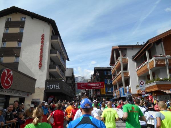 Zermatt liegt am oberen Ende des Mattertals auf einer Höhe von etwa 1600m. Das Dorf ist umgeben von 29 Bergen, die höher sind als 4000m, unter ihnen das Schweizer Wahrzeichen und Toblerone-Emblem, das Matterhorn. Das Matterhorn ist einer der Gründe, warum ich uns für den Lauf überhaupt angemeldet habe - und ausgerechnet heute versteckt es sich unter einer dicken Wolkendecke. Zum Glück werden Christian und ich heute nicht so schnell unterwegs sein, sodass das Wetter genug Zeit hat, sich zu ändern. Der Startschuss fällt und die pink Benummerten aus Startblock eins rennen los. Die Straßen von Zermatt sind viel zu schmal für so viele motivierte Läufer und jeder tritt dem anderen auf die Hacken. Macht nichts, das sind wir schon gewohnt: U-Bahn, Einkaufszentrum, Volkslauf – in Berlin ist ja sonst auch immer alles voller Menschen. Die ersten Kilometer verlaufen durch Zermatt und sind herrlich kurzweilig. Betagte Holzhäuser, Edelhotels und Cafés säumen die Strecke und die einen oder anderen Skifahrer machen sich auf dem Weg zur Gondel, um am „Matterhorn Glacier Paradies“ ihre Bögen zu schwingen. Neid? – Ein bisschen, aber die haben keine pinke Starnummer.
