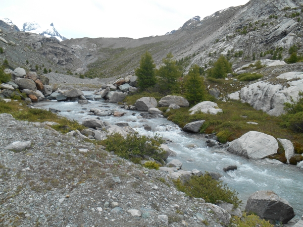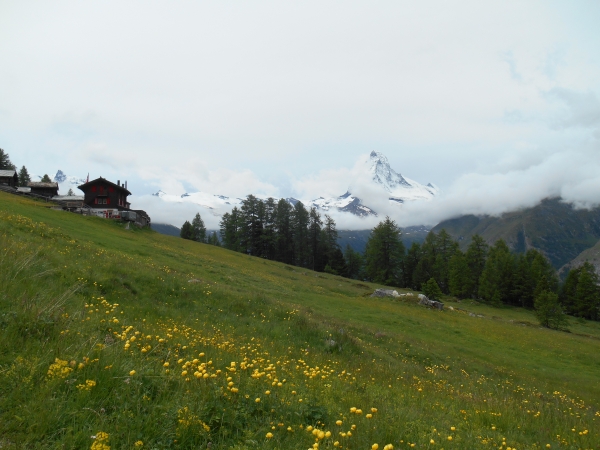 Frisch gestärkt laufe und erzähle ich weiter. Der Schotterweg führt uns durch aromatische Wälder, entlang an saftigen Wiesen und während wir uns serpentinenartig Richtung Sunnegga hinaufschlängeln, können wir doch noch einen Blick auf der Matterhorn ergattern. Nach Sunnegga folgt ein weiterer knackiger Anstieg bis etwa KM 13. Von hier aus geht es über Grünsee bis zur Riffelalp auf schmalen Bergwegen leicht bergab. Das Panorama ist einzigartig und man muss sich entscheiden, ob man auf seine Füße guckt oder die Landschaft genießt.