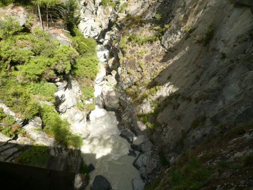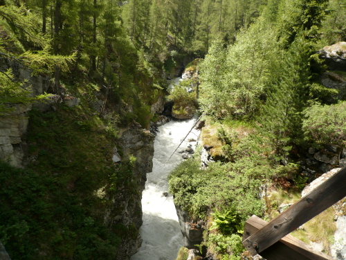 Nach einer weiteren Verpflegung in Täsch geht es nicht mehr weit und die Straße wird verlassen. Es geht hinunter zu einer gedeckten Holzbrücke über die Schlucht. Von hier an ist Trailrunning angesagt.
