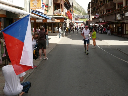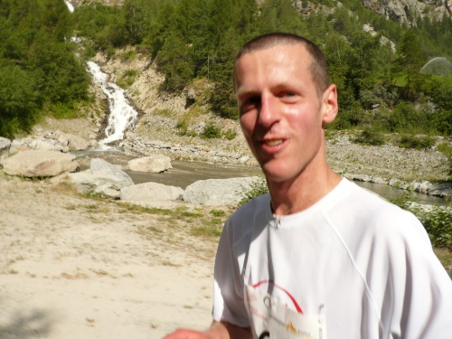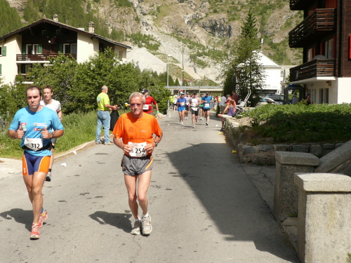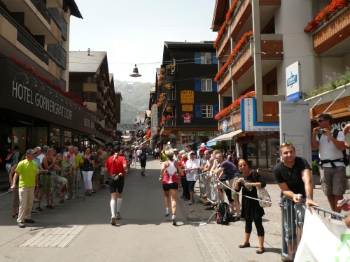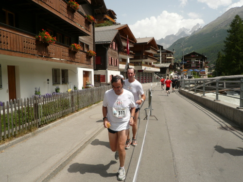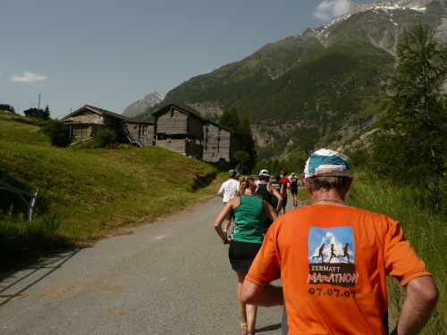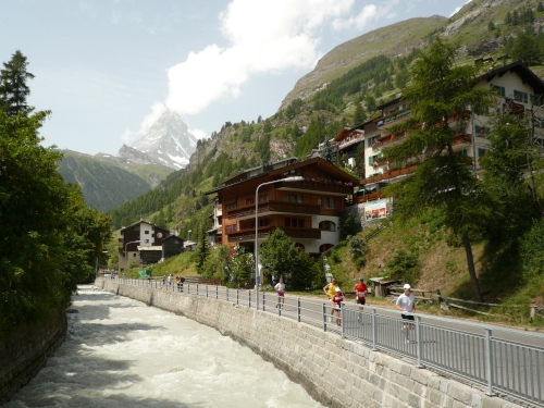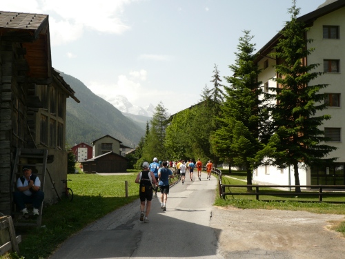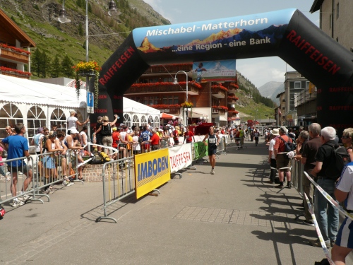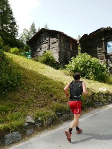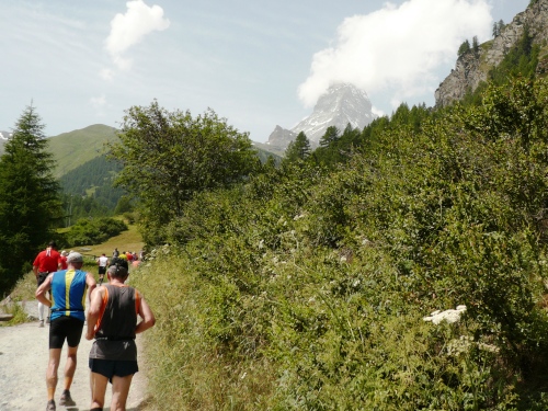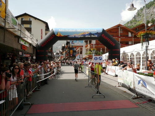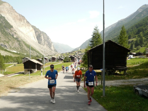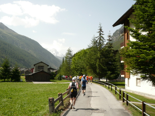 Der Flow wird dann aber abrupt gestört. Eine kleine Unachtsamkeit lässt Patric stolpern. Seine Bewegungseinschränkung erlaubt ihm kein Folgen linderndes Abrollen, und so helfe ich einem mit zahlreichen Schürfungen und einem Schrecken versehenen Läufer wieder auf die Beine. Zermatt und damit die Möglichkeit einer Versorgung durch die Sanität sind zum Glück nicht mehr weit. Bald schon ist offensichtlich auch der Schrecken gewichen, denn Patric zieht mir schon wieder davon.