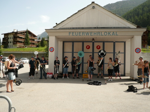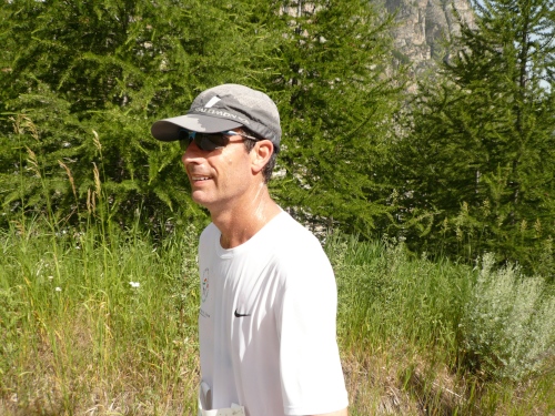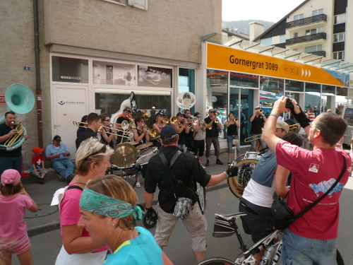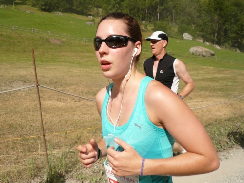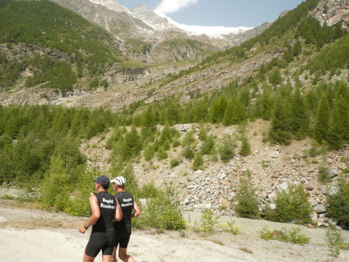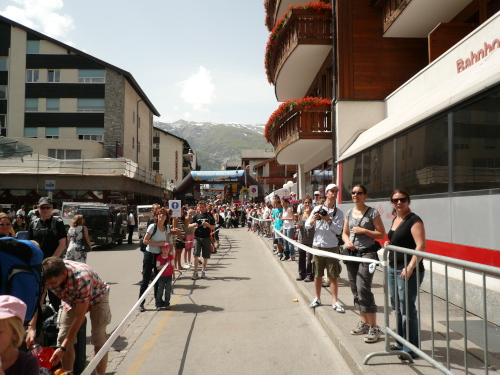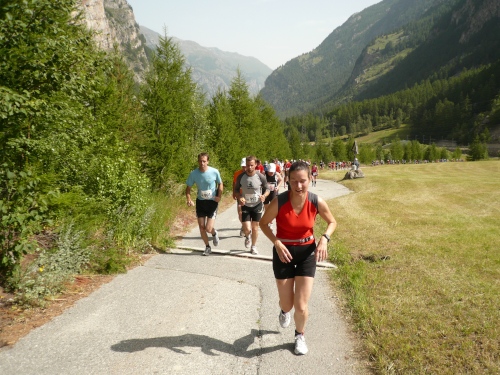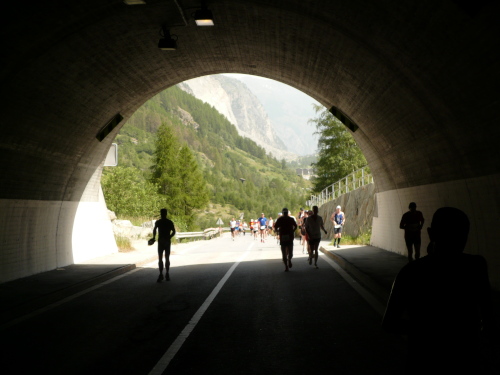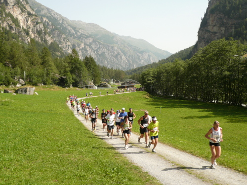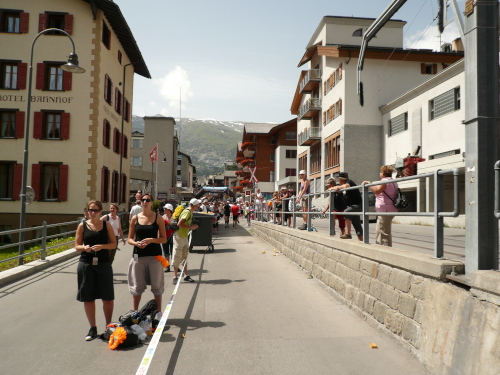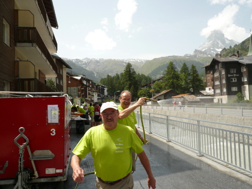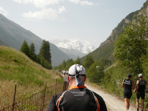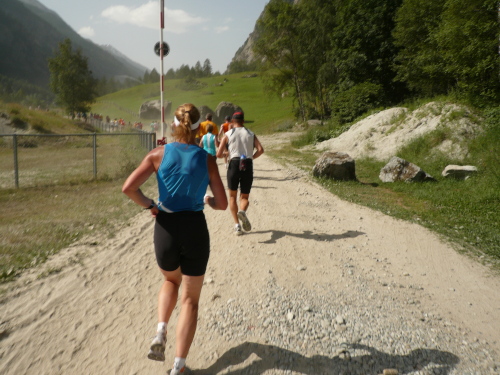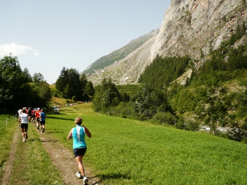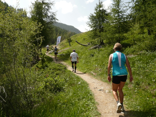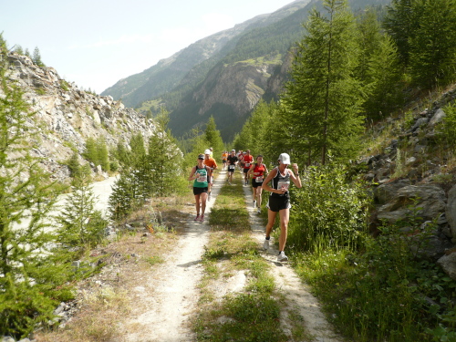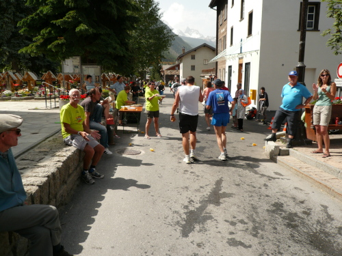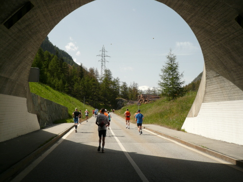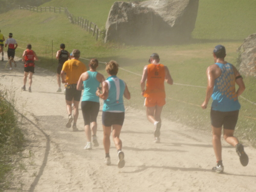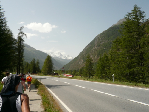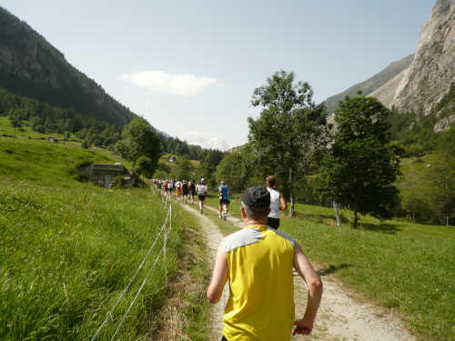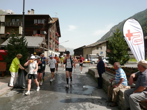 Wer trotz der Wärme Zeit hat sich umzusehen, wird von Beginn weg mit einer tollen Aussicht auf die umliegenden Berge belohnt. Leider vermag diese den trockenen Mund nicht zu befeuchten. Der Eindruck der südländischen Temperaturen wird auf der Naturstraße durch den aufgewirbelten, sich hartnäckig in der warmen Luft haltenden, feinen Staub verstärkt. Eine Wüstenprüfung in den Alpen gewissermaßen. Abhilfe schaffen nach gut fünf Kilometern die freundlichen Helfer an der ersten Verpflegungsstation bei Herbriggen. Die Tische sind bestens vorbereitet und es gibt keinen Engpass beim Nachschub, obwohl ich nicht der einzige bin, der hier schon vier Becher Flüssiges in sich hineinschüttet.