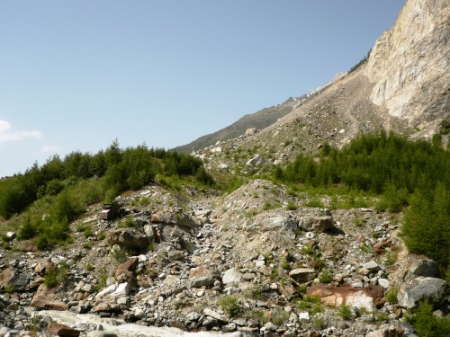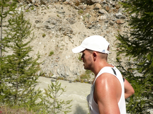 Stetig leicht ansteigend geht es talaufwärts, der Mattervispa entlang zum gewaltigen Schuttkegel des Bergsturzes von 1991 bei Randa. Patric läuft inzwischen ein Stück vor mir, da ich zwischendurch die Eindrücke auf der Strecke fotografisch festhalte und ich es auf einem kürzeren stärker ansteigenden Stück etwas gemütlicher nehme.