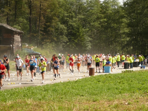 Am Verpflegungsposten erfahren wir, dass die Sanitätsstelle weiter vorne bei der Wechselstelle für die Staffel sei. Während ich mich ausgiebig verpflege, geht Patric schon mal vor, um seine Schürfwunden versorgen zu lassen. Nach ausgiebiger Hydration gehe ich auch zur Wechselzone, bleibe nach der Zeitmessung stehen und halte Ausschau nach dem Sanitätsposten. Ich finde dann heraus, dass der schon fünfzig Meter vorher war und bin überzeugt, dass Patric noch dort ist. Nach längerem Warten frage ich einen Helfer, ob er für mich herausfinden könne, ob mein verletzter Kumpel sich noch dort aufhalte. Die Kommunikation klappt schließlich und ich erfahre, dass auch Patric den Sanitätsposten nicht gesehen hat und weitergelaufen ist. Mist, dann muss er jetzt zehn Minuten Vorsprung haben. Was bleibt mir jetzt anderes übrig, als allein weiterzuziehen und zu schauen, ob und wo ich wieder auf „meinen Schützling“ treffe, dem ich meine Unterstützung versprochen habe.