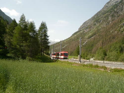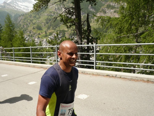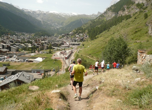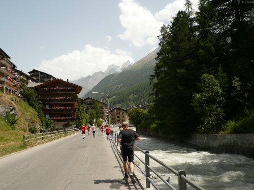 Auf der kurzen Begegnungsstrecke ausgangs Zermatts kommt mir Patric entgegen und wir machen ab, dass er vorerst alleine weiterläuft. Bis nach Sunnegga hoch schafft er das problemlos, die Beschaffenheit der Forststraße und die gleichmäßige Steigung werden für ihn gut zu bewältigen sein.
