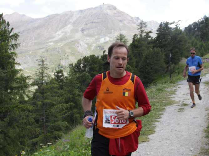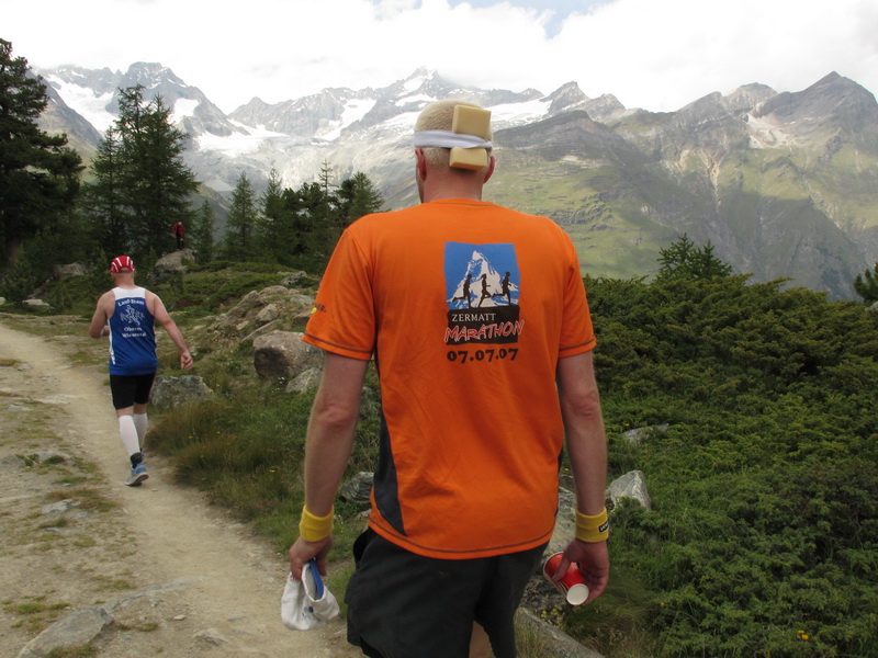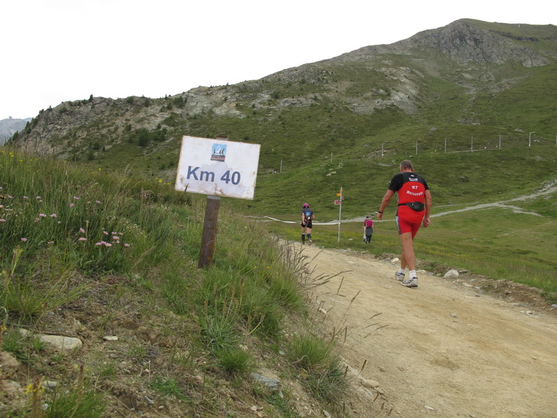 Am gleichnamigen Berggasthof (km 36) ist eine weitere Verpflegungsstelle eingerichtet. Obwohl wir weitere Höhenmeter verlieren, ist der Weg wegen seiner Beschaffenheit zunächst ziemlich beschwerlich. Später ist er fast flach und gleicht einer Jogger-Promenade mit herrlichen Blicken über alte Lärchen hinüber nach Sunegga. Außer dass die Bewölkung die Sicht behindert, stört sie den Betrachter kaum. Fast wirkt die uns umgebenden gigantischen Bergwelt dadurch noch ursprünglicher und dramatischer.