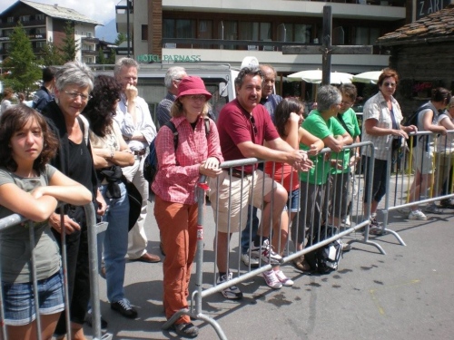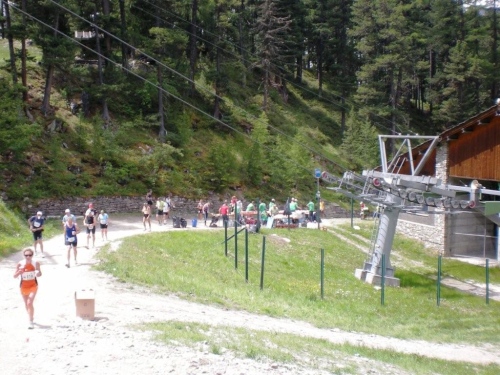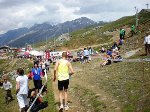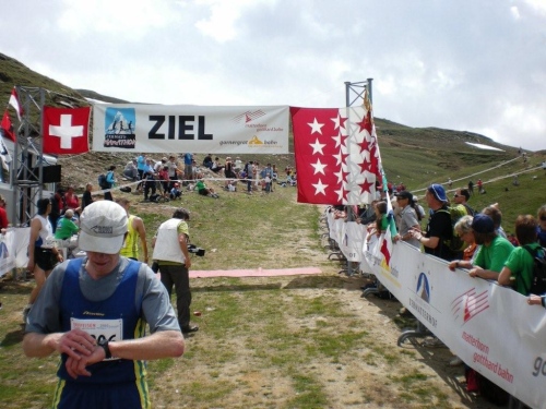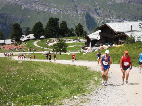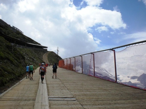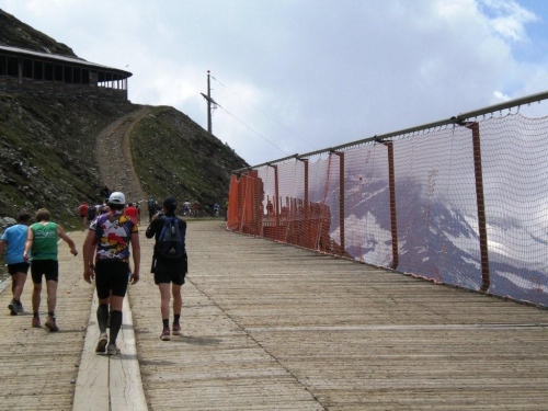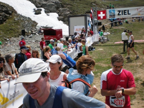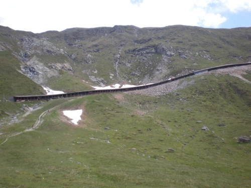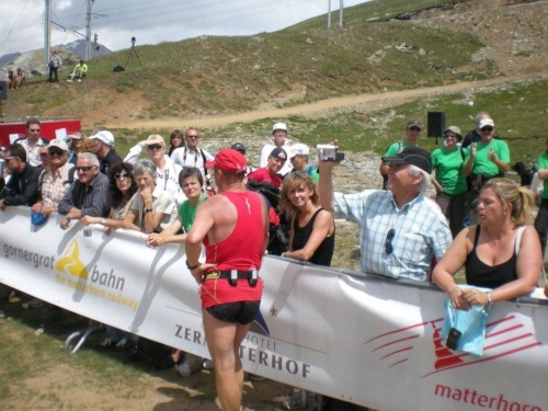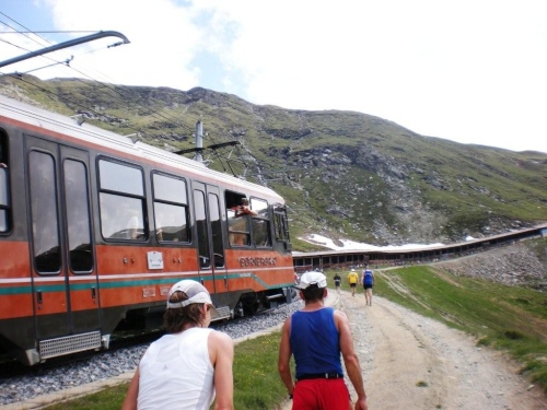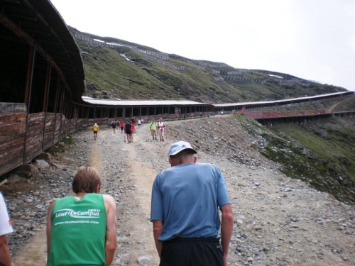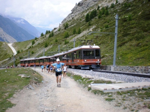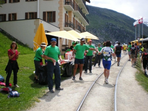 Auf der Riffelalp quert die Marathonstrecke die Geleise der Gornergrat Bahn. Es ist schon die dritte Querung von Geleisen und wieder haben wir Vortritt. Ist das die Gnade der richtigen Durchgangszeit oder wirklich die unermessliche Rücksicht der Bahnbetriebe die im Reigen der Hauptsponsoren mitwirken? Von der Haltestelle Riffelalp bis zum Resort Riffelalp führen uns die Schienen der höchstgelegenen Straßenbahn. Am Verpflegungsposten vor dem Hotel wechsle ich meine Wasser- und Iso-Diät und stelle um auf Cola, begleitet von meiner obligaten Frage, ob ich diese auch intravenös haben könne. Den Zucker- und Koffein-Kick brauche ich nämlich sofort. Wie eine Wand tut sich der Schlussaufstieg vor mir auf und weit oben ist die Schutzgallerie für die Bahnstrecke zu sehen, welcher wir dann folgen werden. Über dieser Klippe liegt der Riffelberg, das Ziel; nur noch zweieinhalb Kilometer entfernt aber vierhundert Meter weiter oben.