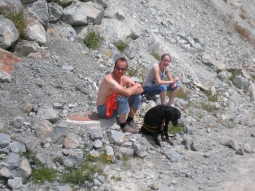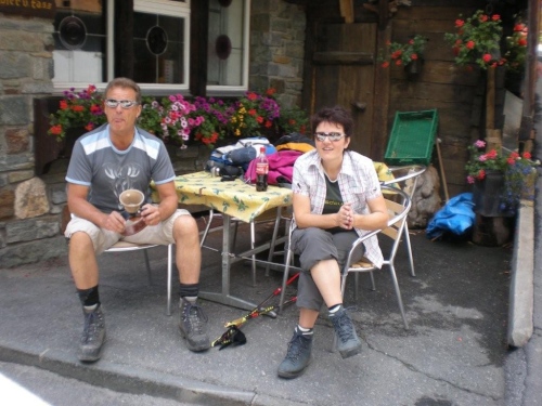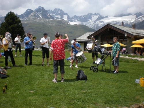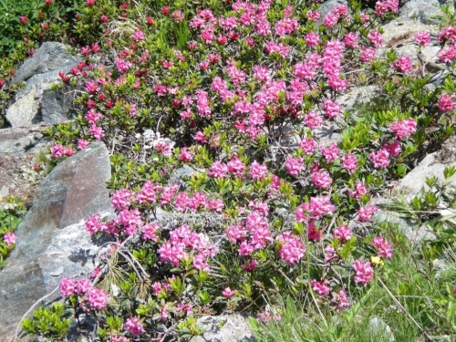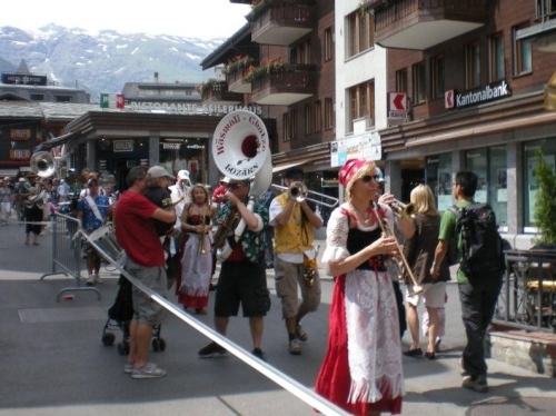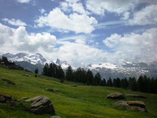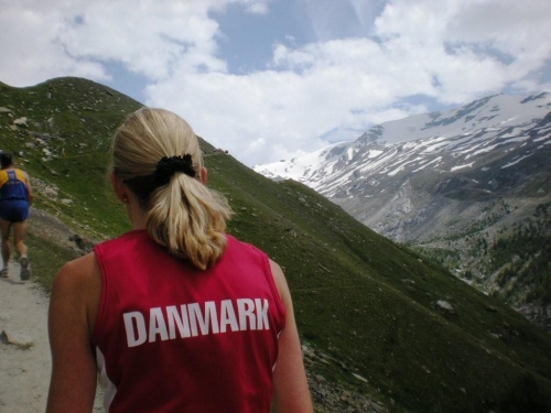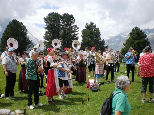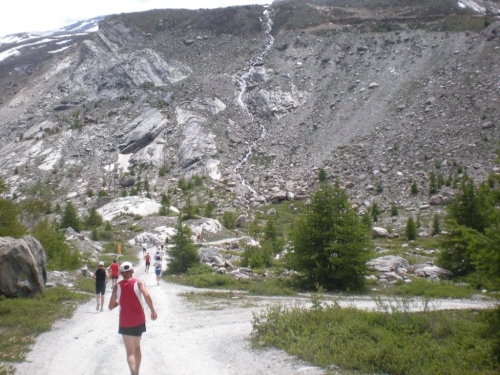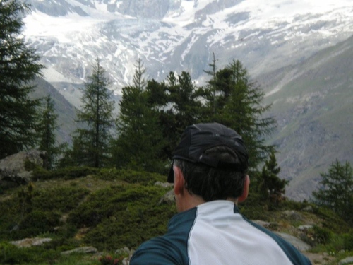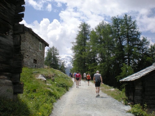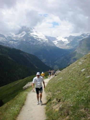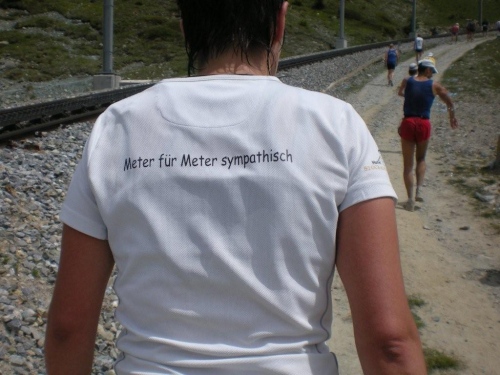 Mittlerweile dämpfen ein paar Wolken die starke Sonneneinstrahlung, der Aussicht tut dies keinen Abbruch. Zwar zeigt sich das Matterhorn - einer Diva gleich - immer verhüllt, trotzdem könnte man das Wetter als fast kaiserlich bezeichnen. In meiner Bergbauern-Gangart schließe ich immer wieder zu anderen Teilnehmern auf und mache eine kleine, interessante Entdeckung. Immer wenn ich an einem königsblauen Kleidungsstück vorbeikomme, sehe ich darauf eine Menge kleiner Fliegen oder Mücken, die sich so in die Höhe tragen lassen, obwohl sie fliegen können.