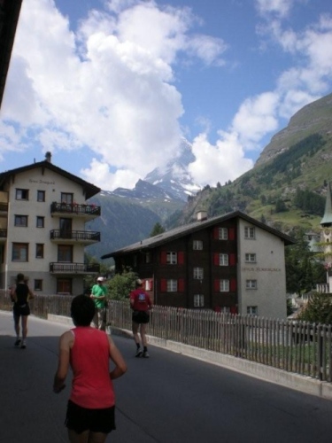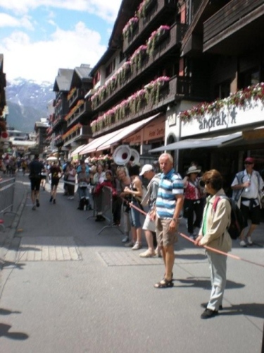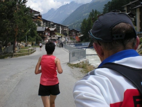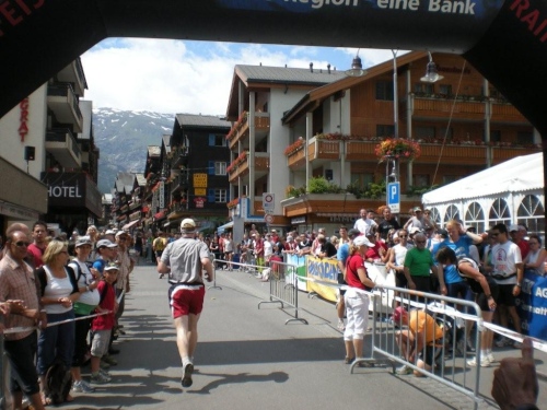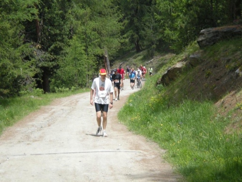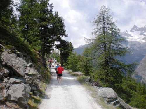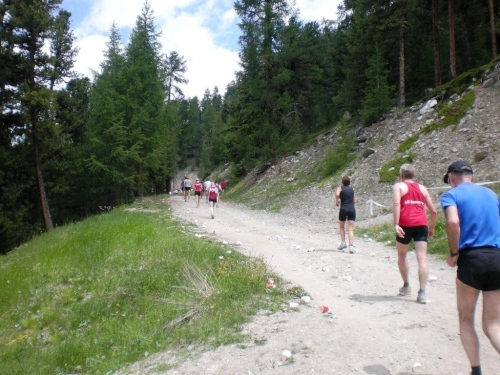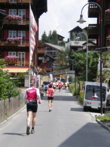 Trotzdem kann ich es kaum erwarten, mich in den Aufstieg reinknien zu können. Vor dieser Kür kommt aber nochmals ein Pflichtprogramm. Am Dorfende kommt noch eine Schlaufe dazu, damit die Streckenlänge stimmt. Aus unerfindlichen Gründen tue ich mich damit schwer, vergleichsweise aber auf einem tiefen Niveau. Als Vergleich dient mir zwar kein anerkannter Maßstab, denn nur wenig mehr als zwei Kilometer nachdem ich ihn ziehen ließ, steht der Drängler von vorher mir vor den Füßen. Eilig habe ich es nicht und ich warte, bis wir wiederdurch Zermatt laufen, bevor ich ihn seinem Schicksal am Berg überlasse. Die nächsten Kilometer bis hoch zu Sunnegga ist die Forststraße breit und es gibt genügend Platz für die verschiedenen Geh- und Laufstile sowie Tempi. Letztere unterscheiden sich aber nicht wesentlich voneinander. Abgesehen von ein paar frischen Staffelläufern gibt es nicht viele Läufer, die an mir vorbeiziehen.